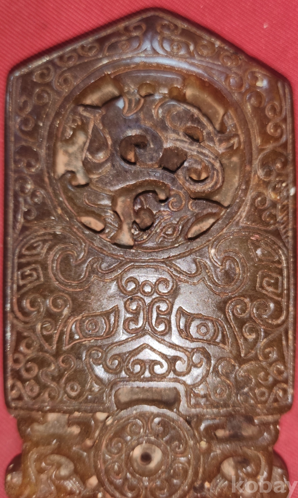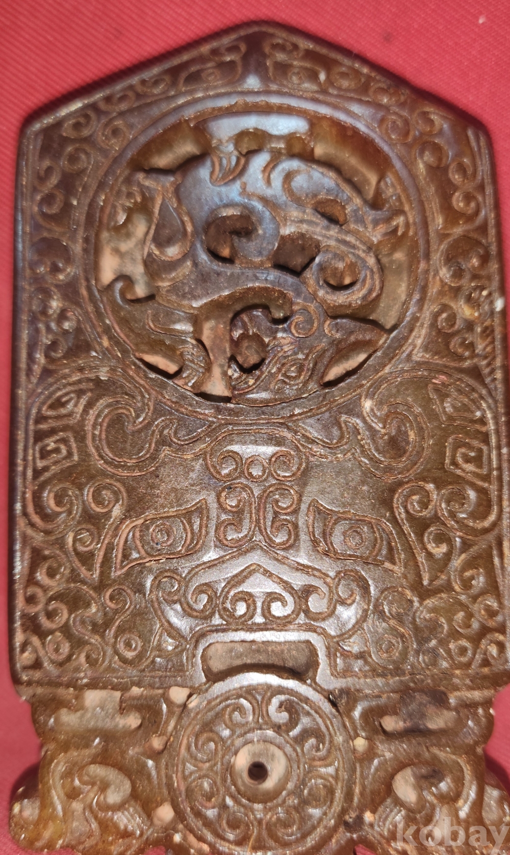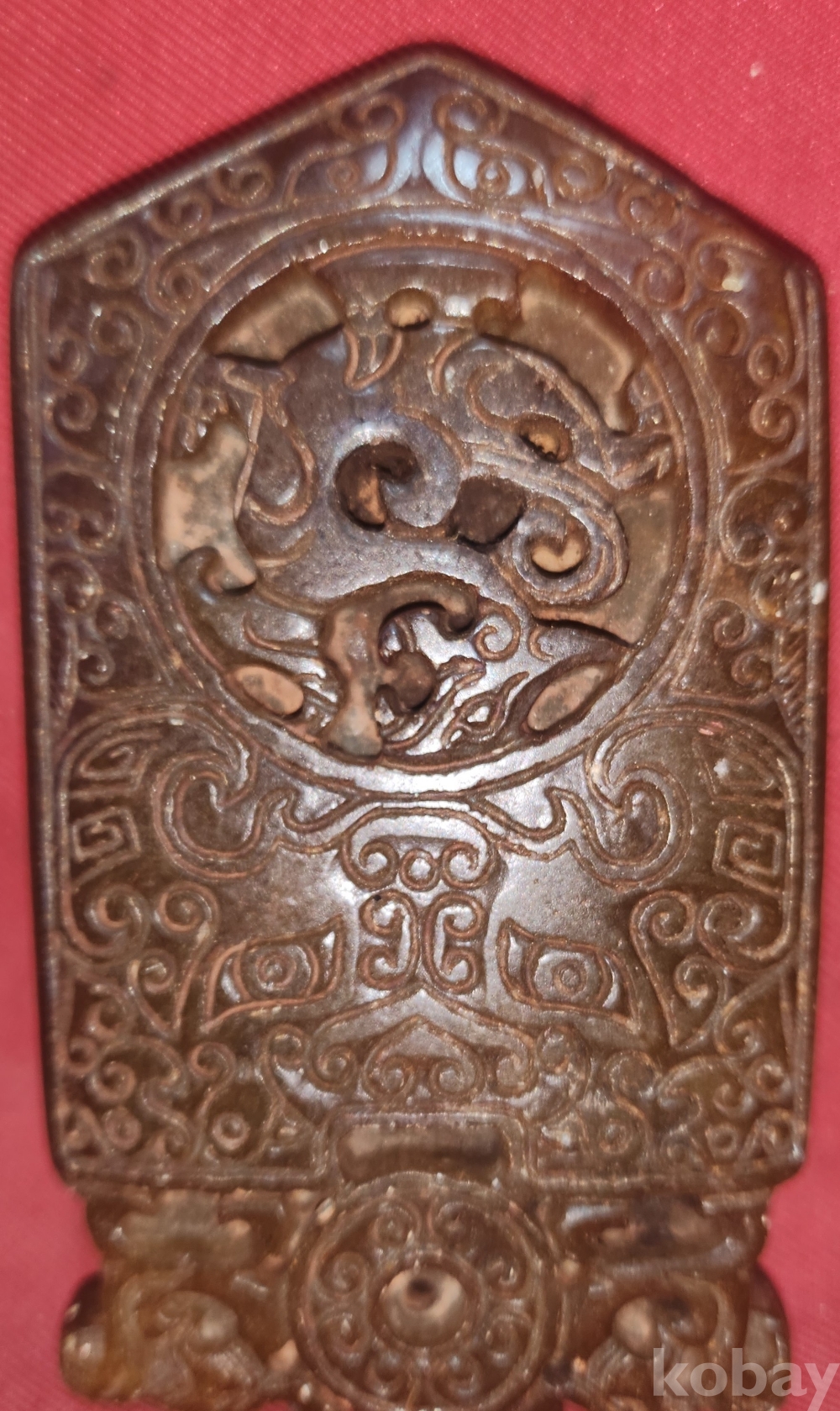 전면에는 투각 용문양이 투각으로 자리하고 상단부에응 구멍이 있어서 실을 꿰어 팬던트로 사용 할 수 있는 기능입니다,