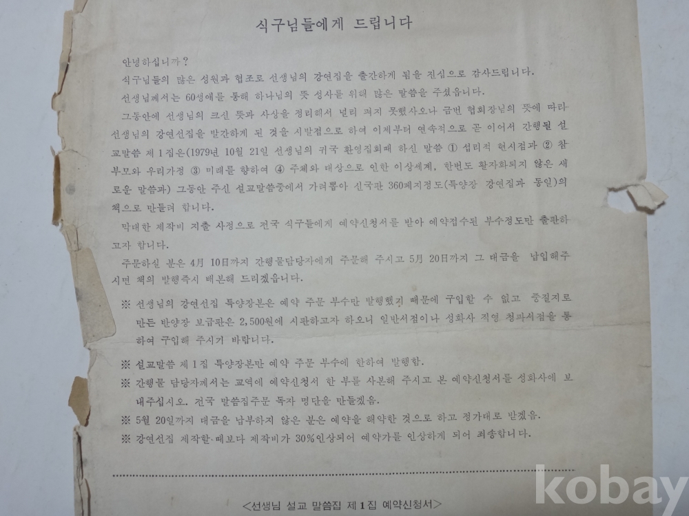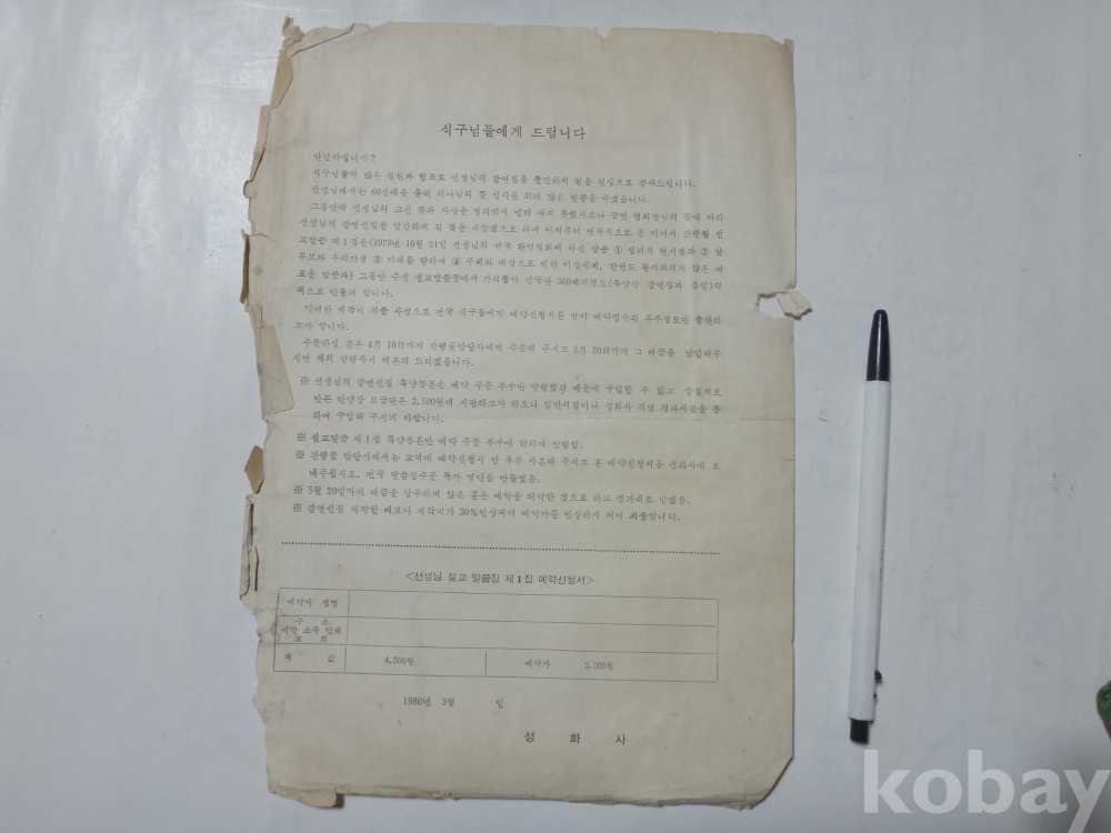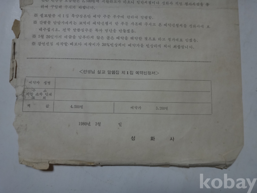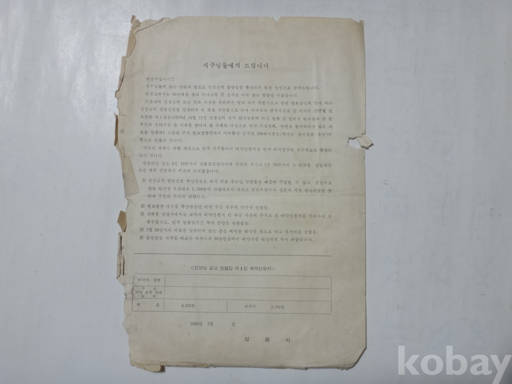 성화사 - 선생님 성교 말씀집 예약 안내문 및 신청서 (1980년)