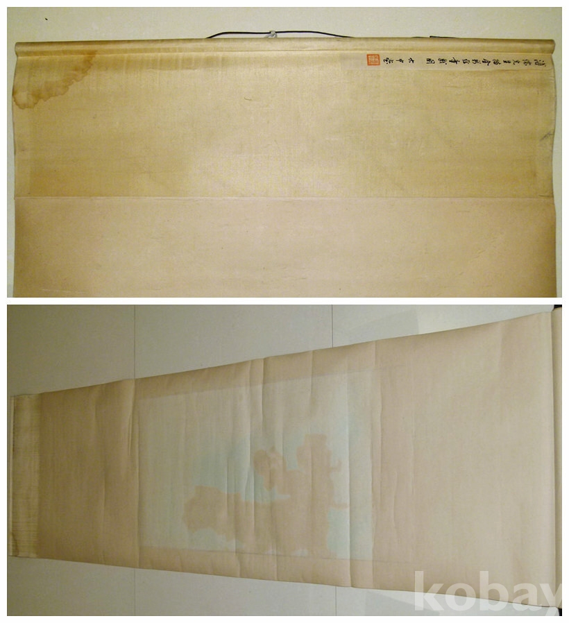고급표구 족자에 잘 보관되어 세월의 변색과 말려 보관되어 미세한 가로 균열과