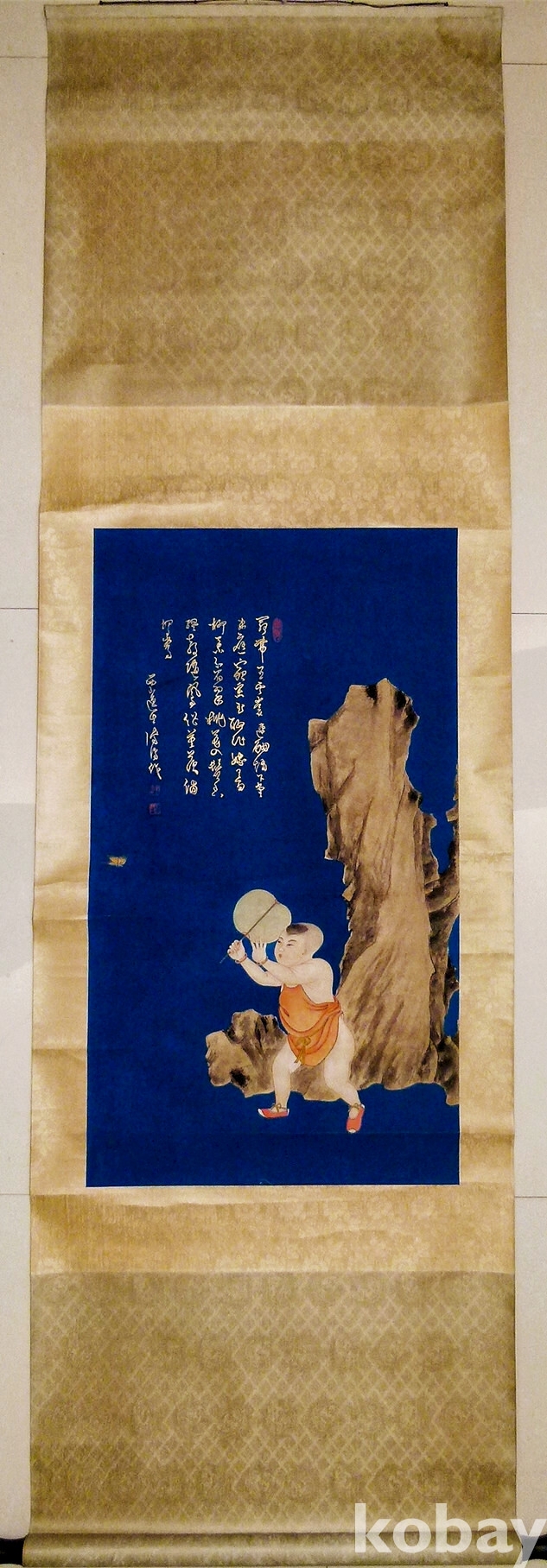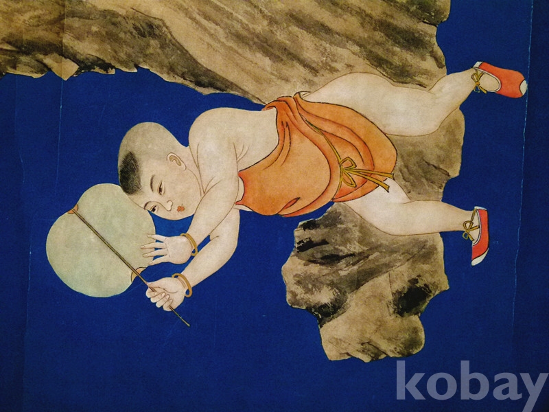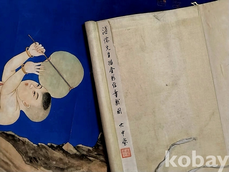 족자 뒷면 상단,부유선생묘금채회동희도(溥儒先生描金彩绘童戏图) 대중당(大中堂)이란