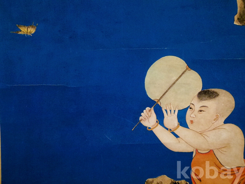생명의 봄을 상징하는 아이와 나비 그리고 장생과 불변의 괴석을