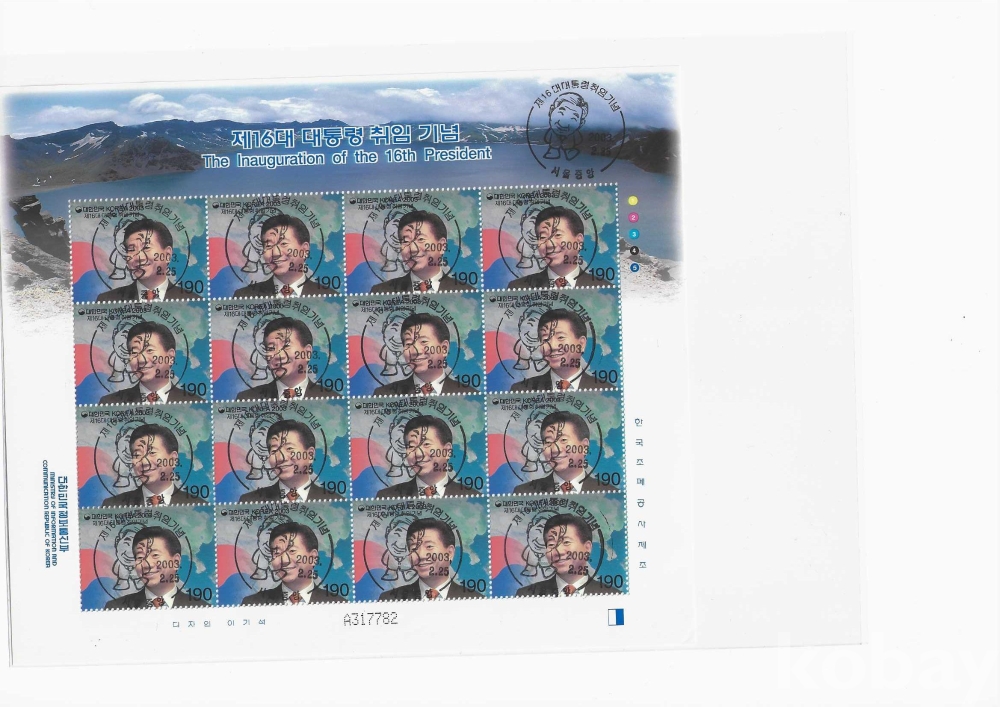 제 16대 대통령 취임 기념 초일 만원 소인 전지