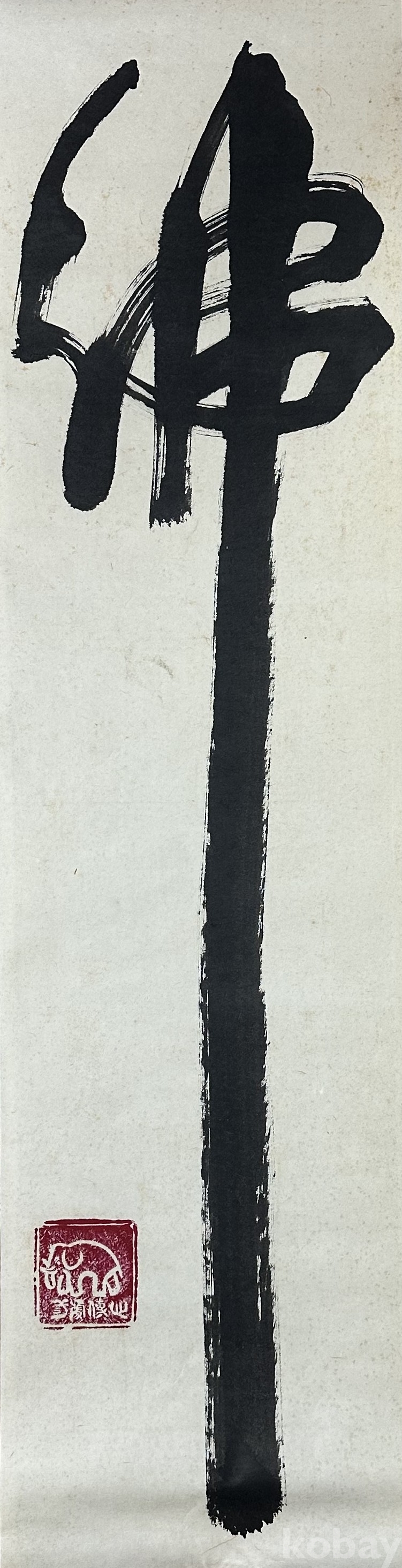 본 작품은 하나의 큰 글자를 강렬한 붓 터치로 표현한 대자 서예 작품으로, 힘 있는 직선과 자연스러운 굴곡이 조화된 추상적 구성입니다. 굵고 거침없는 필획은 에너지가 강하게 느껴지며, 먹의 번짐과 농담이 단순한 형태 속에서도 깊이감을 전달합니다. 좌측의 코끼리 도장은 개성 있는 작가의 성향을 보여주며, 세로형 긴 구도는 공간 연출용으로도 뛰어난 시각적 효과를 냅니다. 모던 인테리어와 전통 공간 모두와 잘 어울리는 장식성 높은 작품입니다.