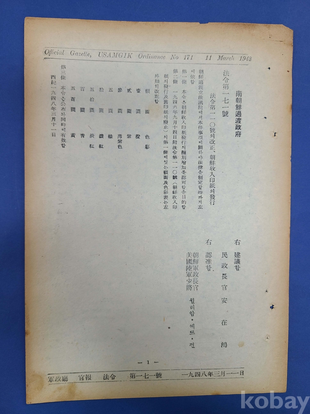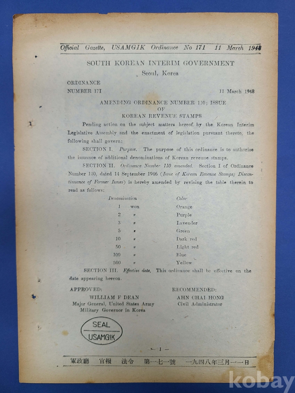 [在朝鮮美國陸軍司令部軍政廳 관보] 1948.3.1 법령제171호/*법령제110호의개정,조선수입인지의발행
