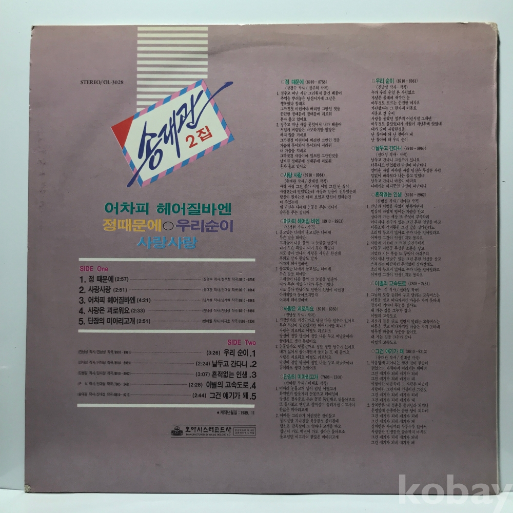 LP 29,200-34 송대관 - 정때문에/ 우리순이 . 89 오아시스 자켓 EX+ 알판 EX+