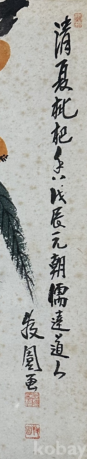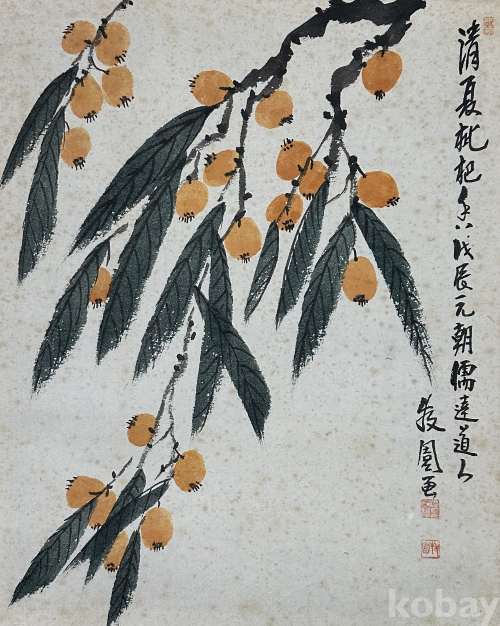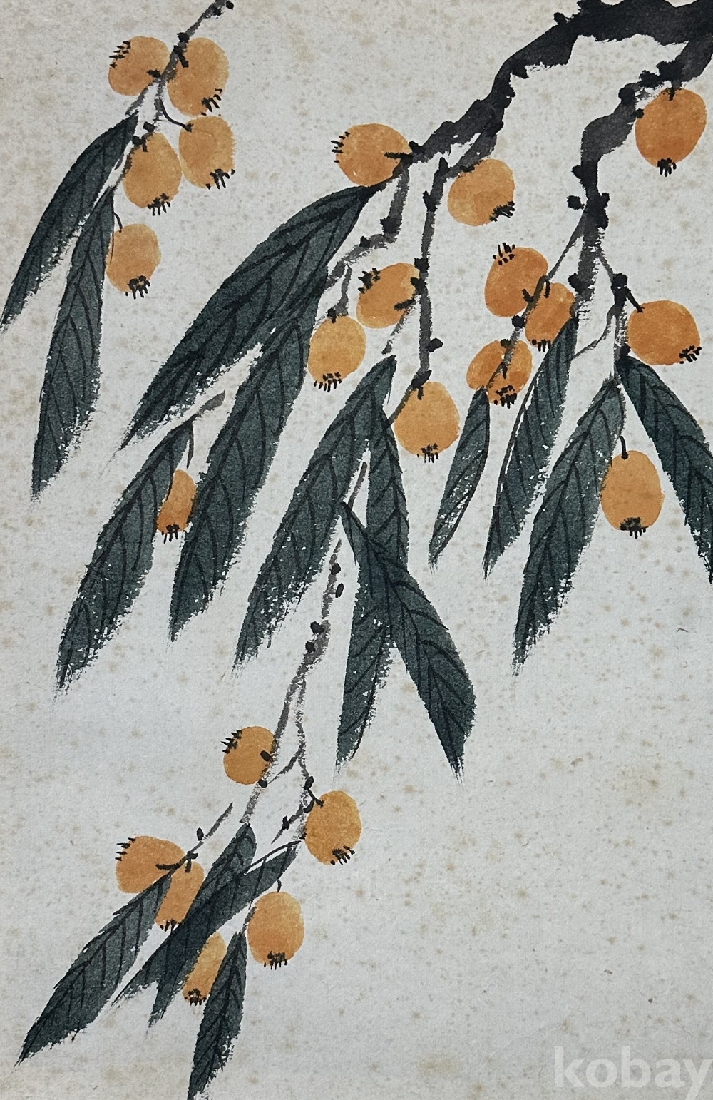 비파나무 가지에 주황빛으로 익은 열매가 달려 있는 모습을 담은 화조도 작품이다. 짙은 녹색의 잎과 대비되는 밝은 색감의 열매를 간결한 필치로 표현하여 화면의 생동감을 더했다. 먹선과 채색이 균형 있게 사용되었으며, 자연스러운 구성과 전통적인 동양화의 운치를 느낄 수 있는 작품이다.