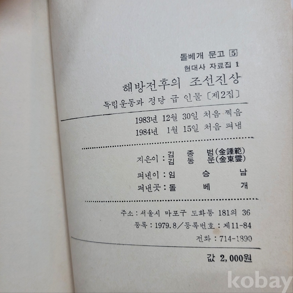 [희귀본] 해방전후의 조선진상_김종범/김동운_1984년 돌베개 초판 ; 중급/서고t307