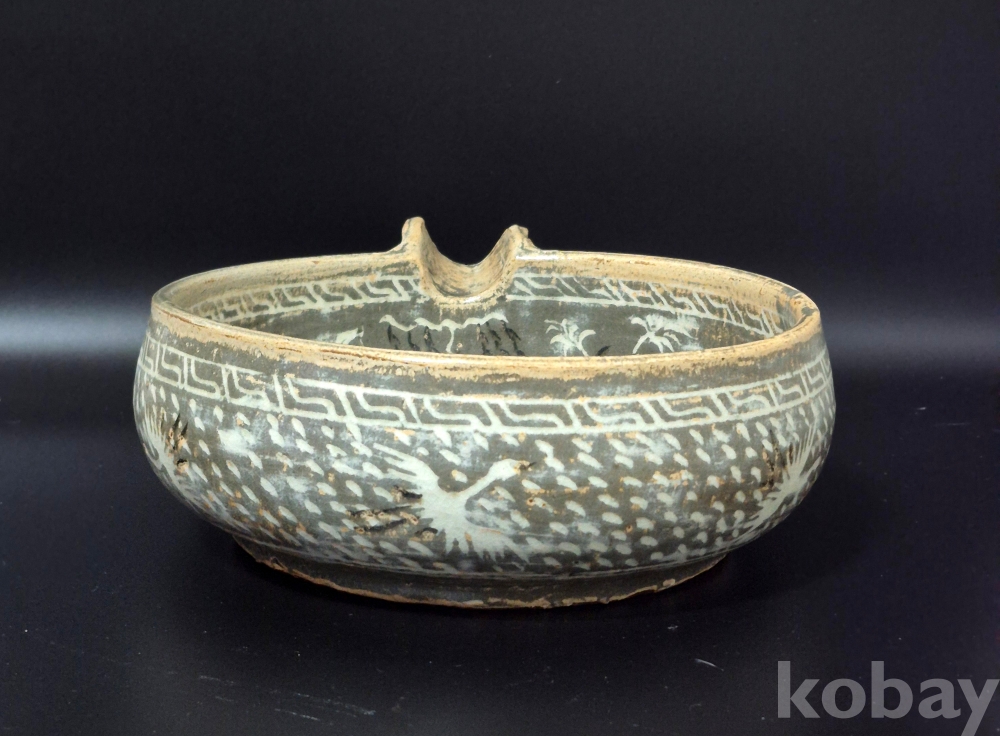 피부가 상당히 거칠어 보이지만 상당히 매끄럽고, 인화문으로 호수의 물고기, 학, 갈대, 버드나무, 연잎 등을 다채롭게 시문한 매우 희귀한 기물입니다. 크기도 상당히 크고, 기벽도 두껍고 무거워 여러 명이 둘러앉아 차를 나눌 때 적당한 것 같습니다.