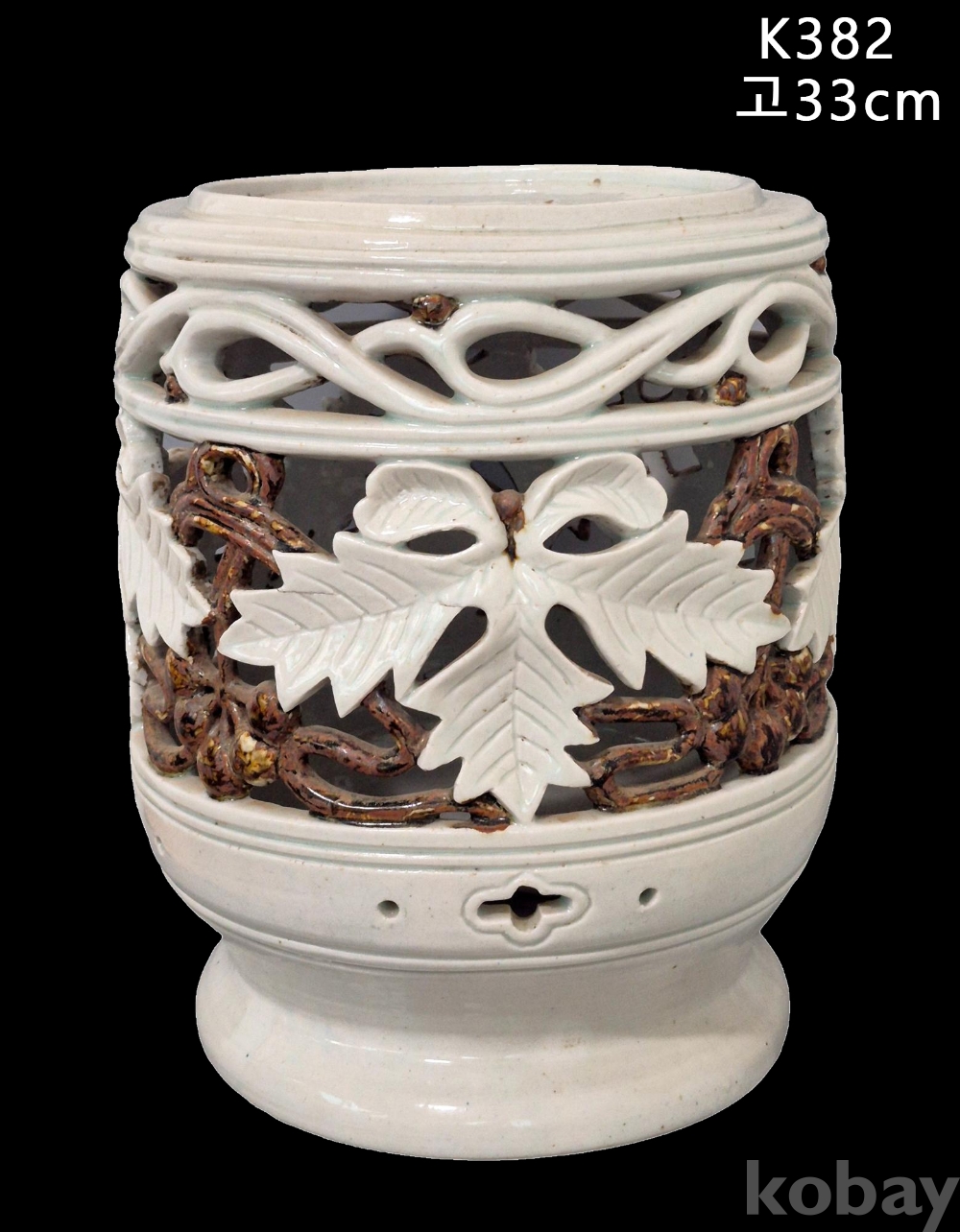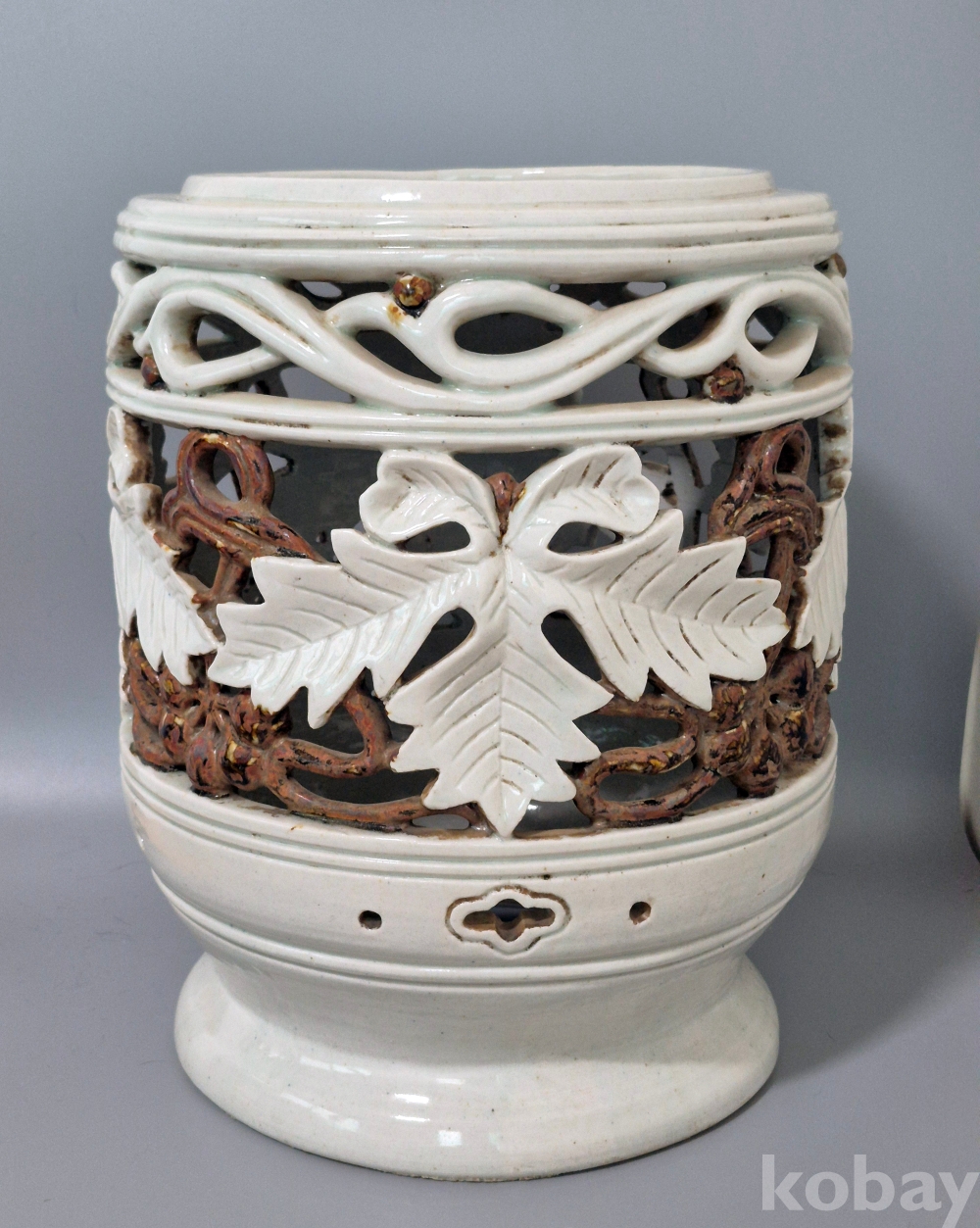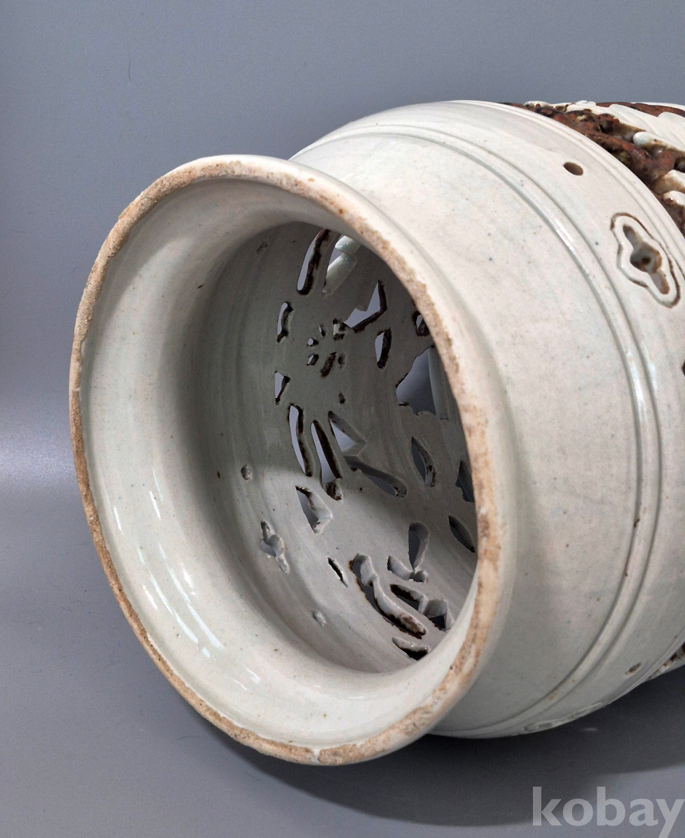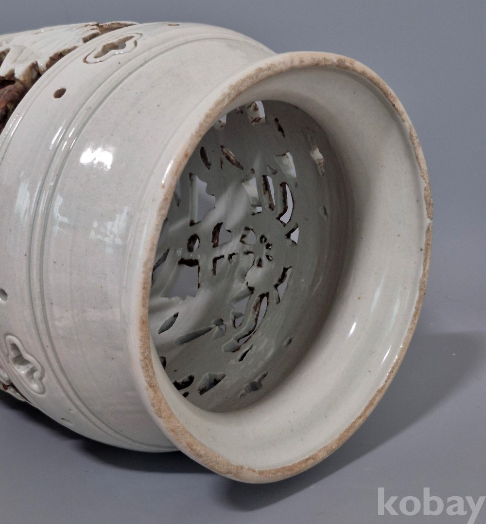 백자에 어려운 기법인 투각으로, 나뭇가지와 커다란 이파리를 철채를 사용하여 대담하게 만들어 놓았습니다.