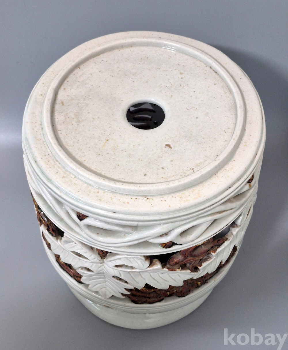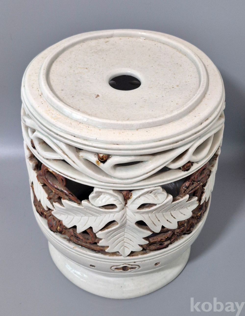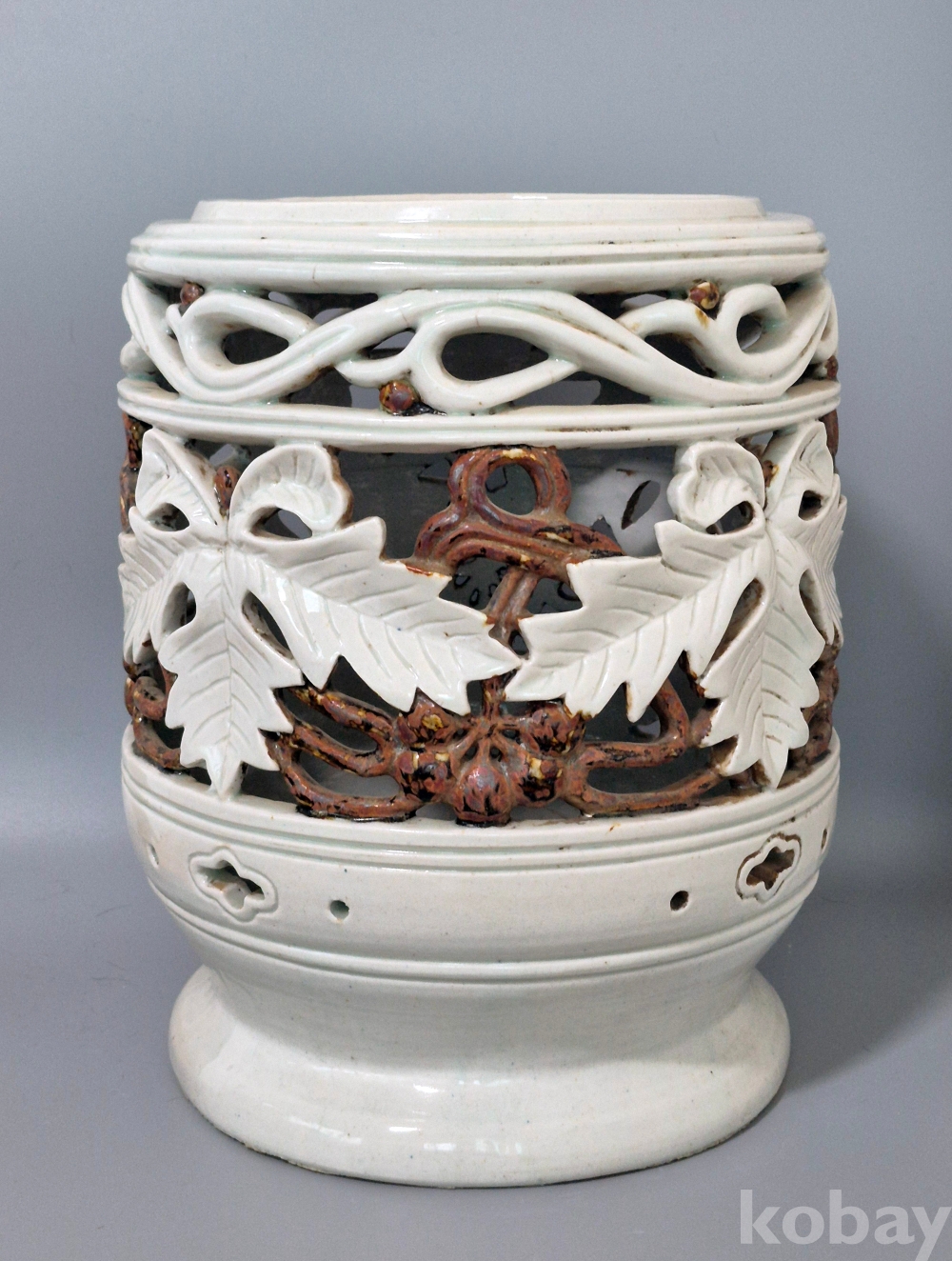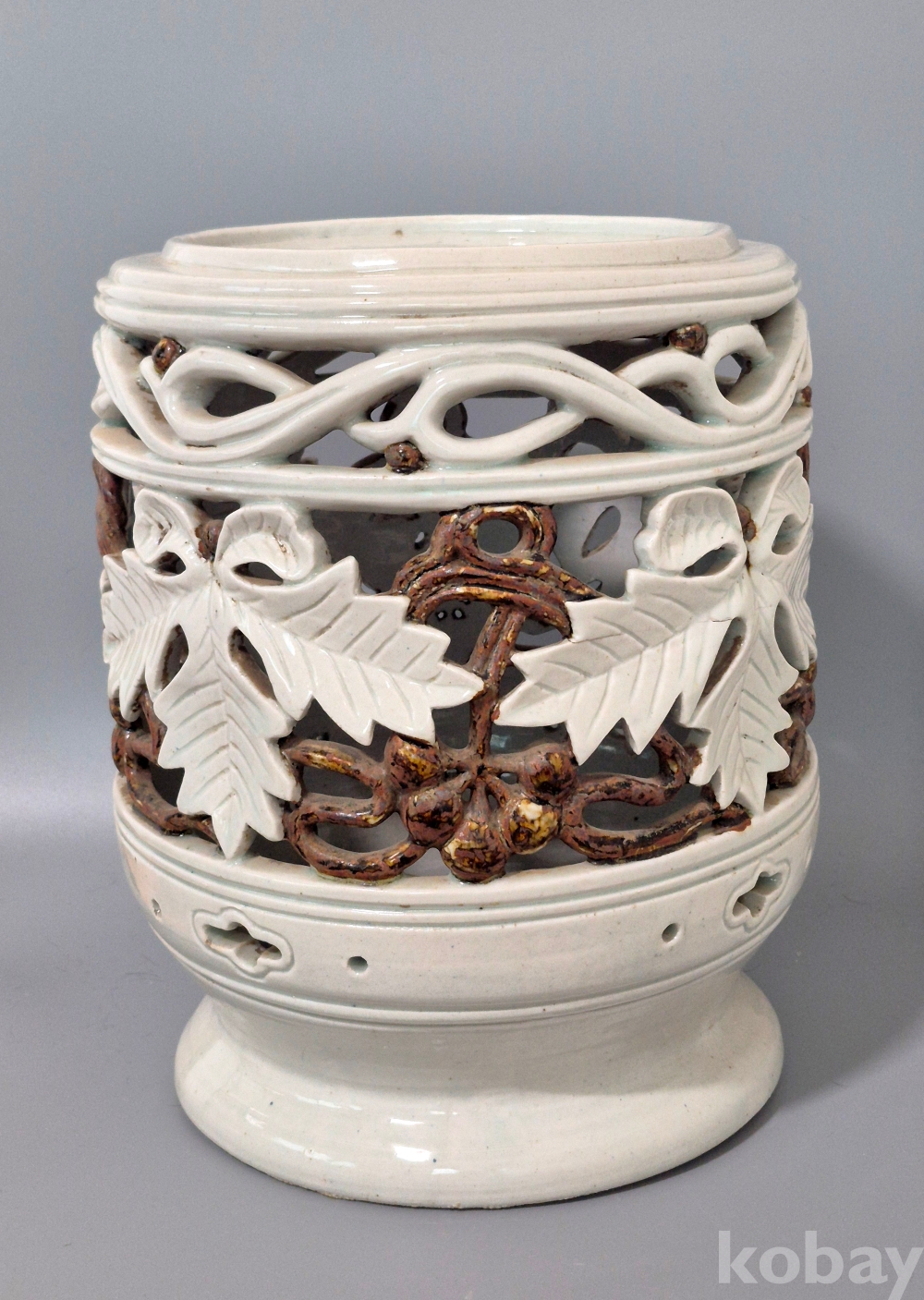 백자에 어려운 기법인 투각으로, 나뭇가지와 커다란 이파리를 철채를 사용하여 대담하게 만들어 놓았습니다.