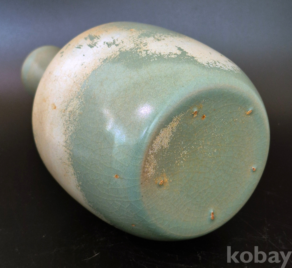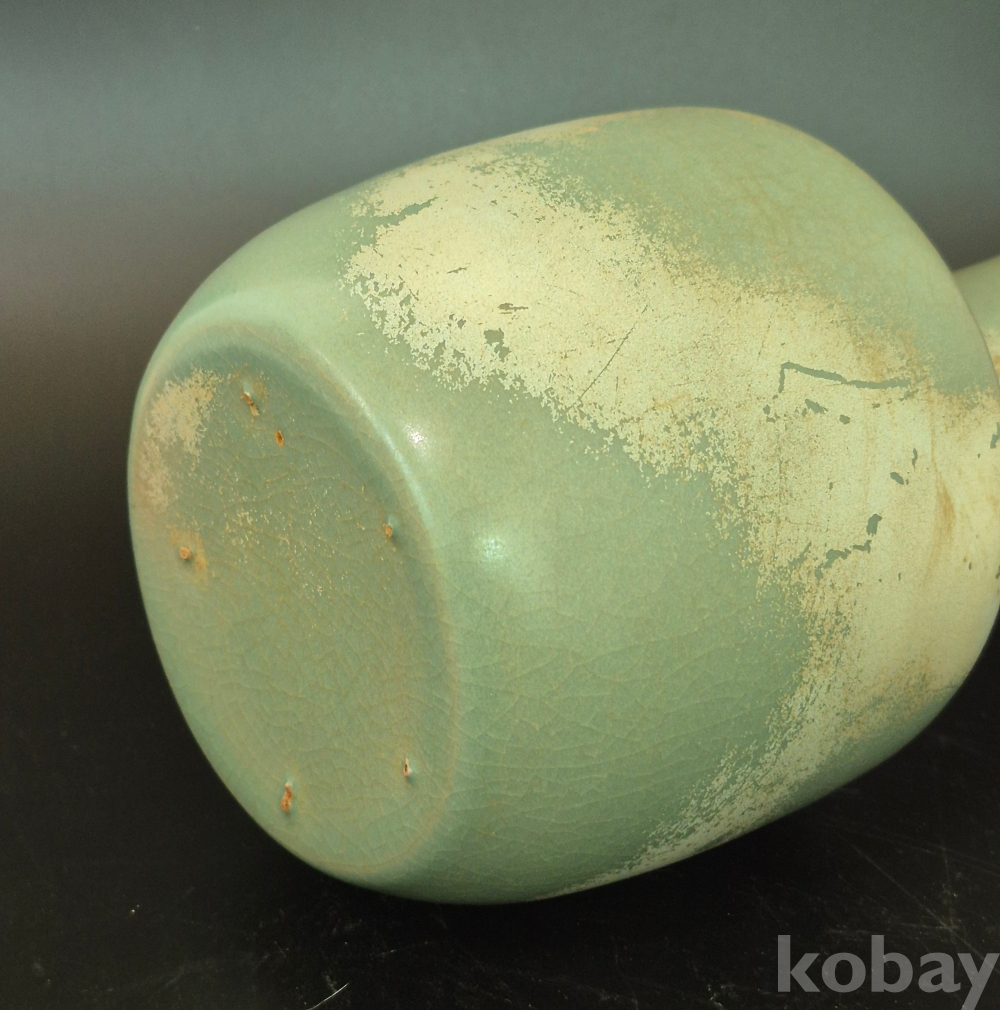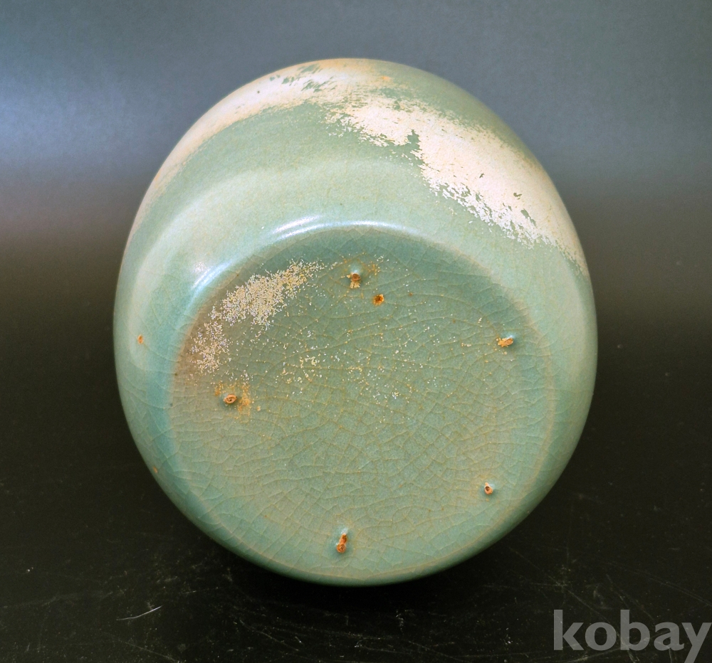 5개의 작은 모래 받침 흔적이 있으며, 이런 것을 참깨 같다 하여 지마정(芝麻釘)이라고 하는데, 송대의 여요에도 자주 보이고, 우리 고려청자에도 적지 않게 나타나며, 살짝 엿보이는 태토는 갈색의 고려청자의 자토와 같은 색입니다.