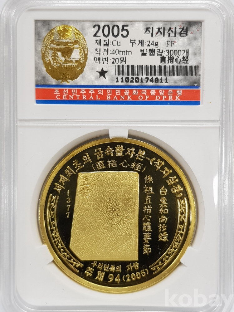 - 2005년(주체94) 직지심경 20원 프루프 인증 주화 - 세계 최초의 금속활자본 직지심경
