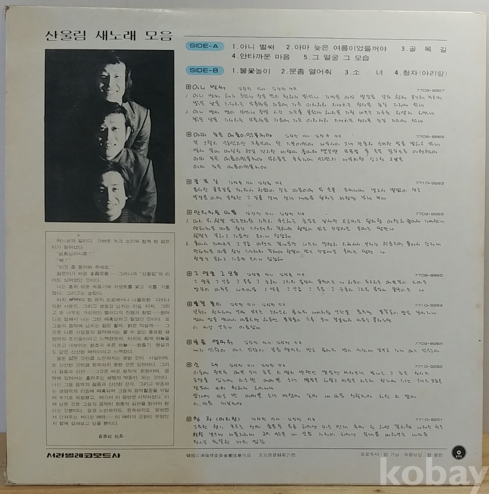 산울림 1집 (아니벌써 / 불꽃놀이) 1977년 서라벌레코드 초반