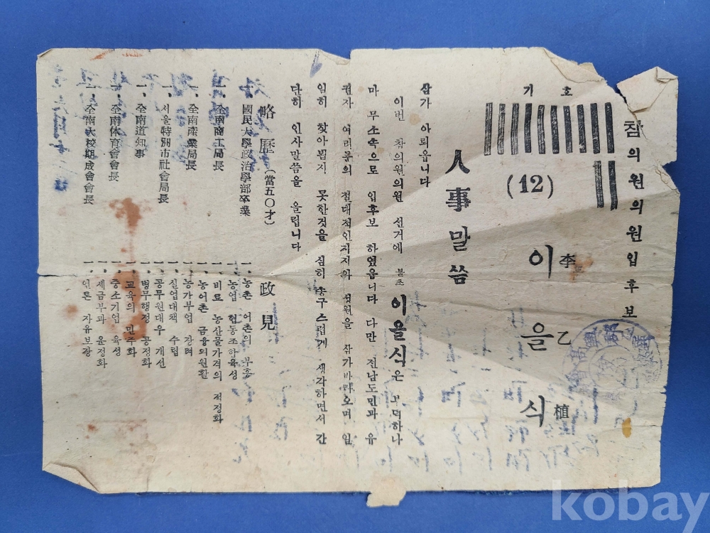 [고흥군] 참의원의원입후보자 기호12 이을식 선거공보/술 자료가 첩부됨