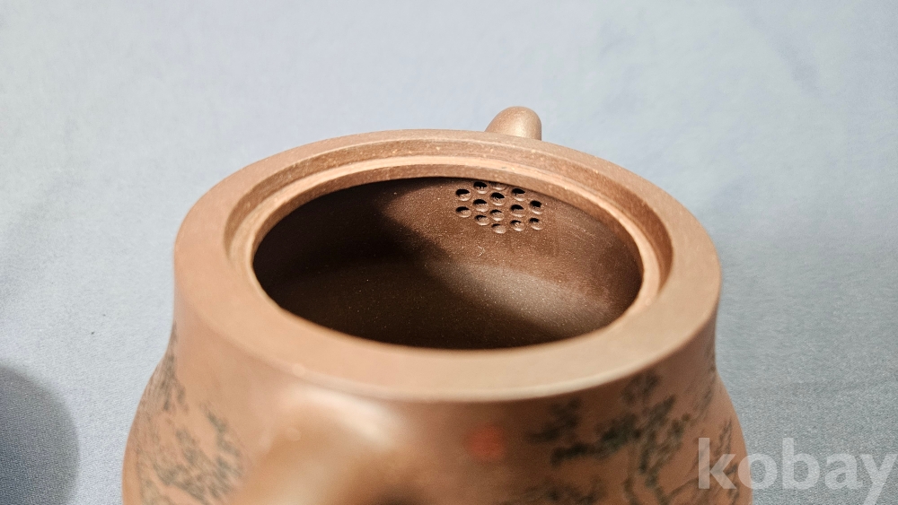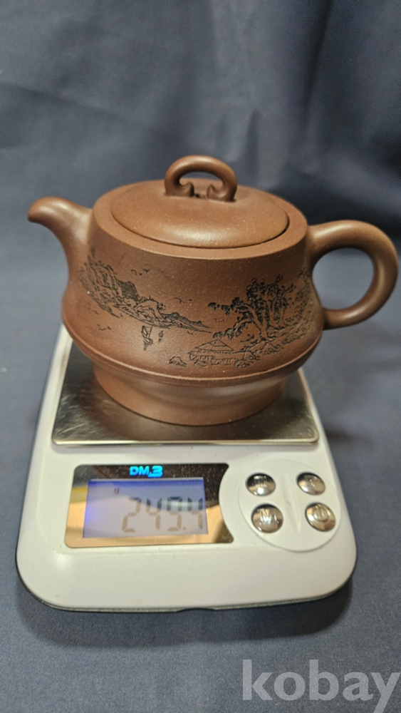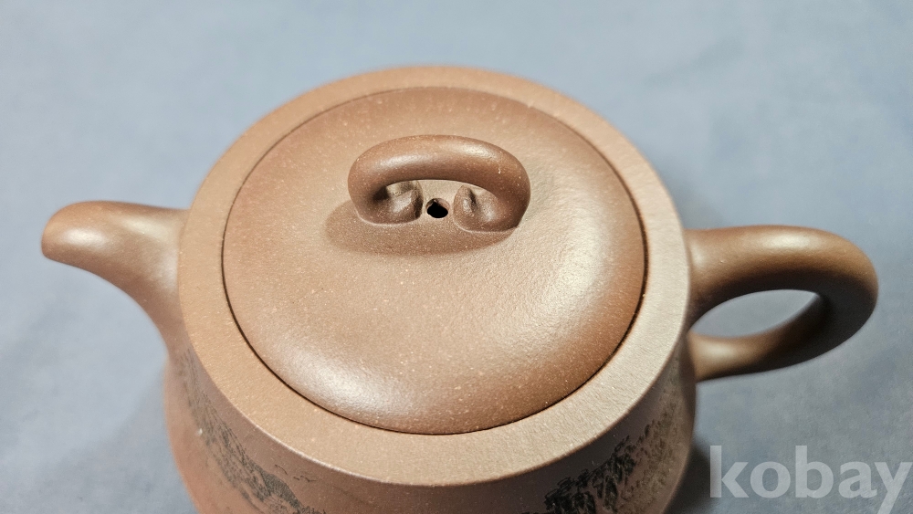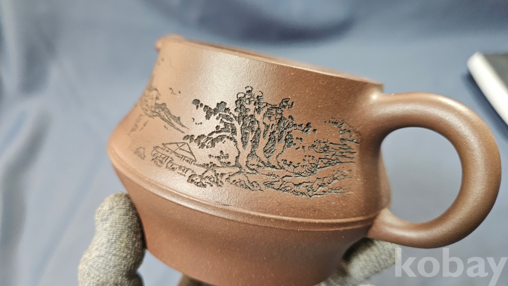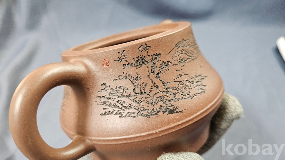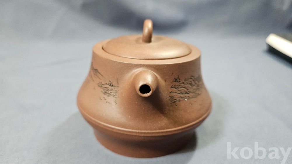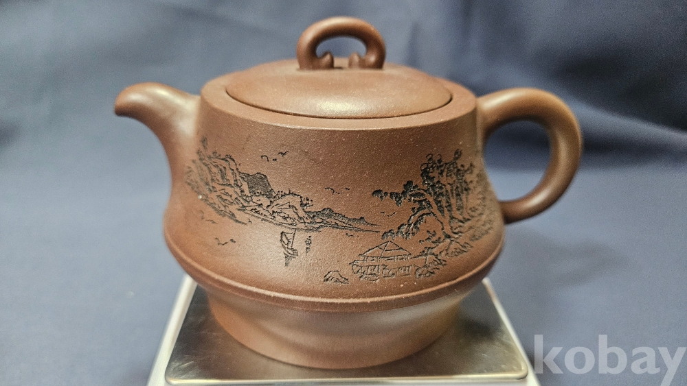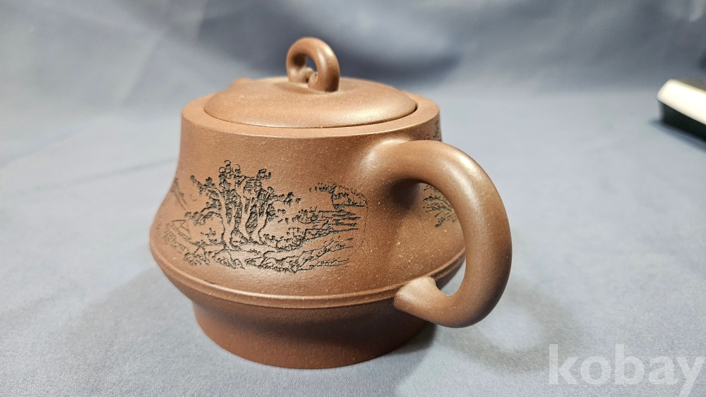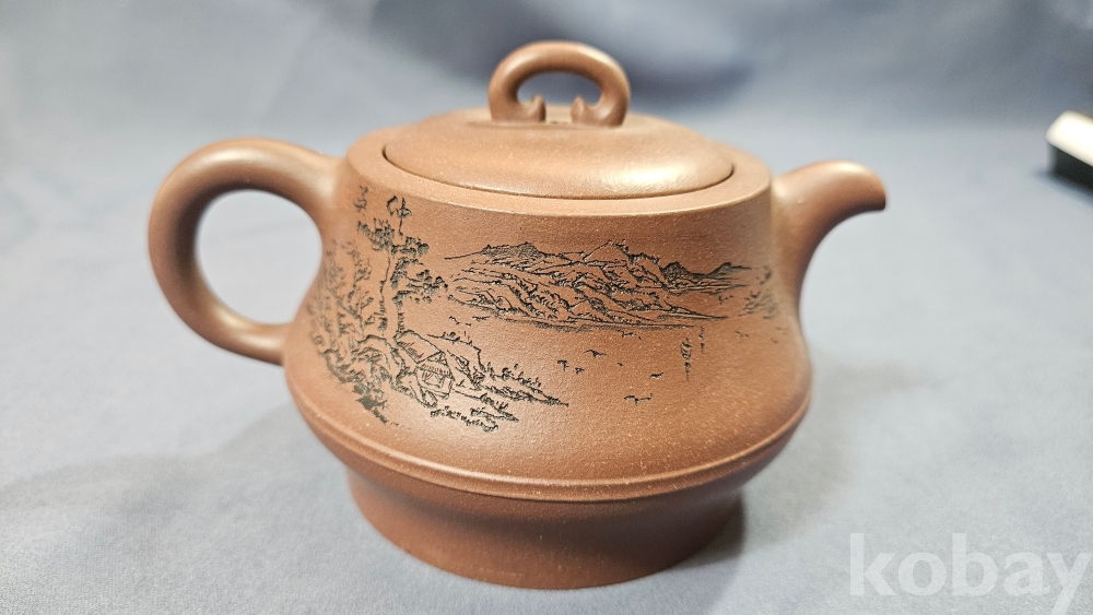 풍경화 문양이 음각으로 들어있는 자사주전자 입니다.