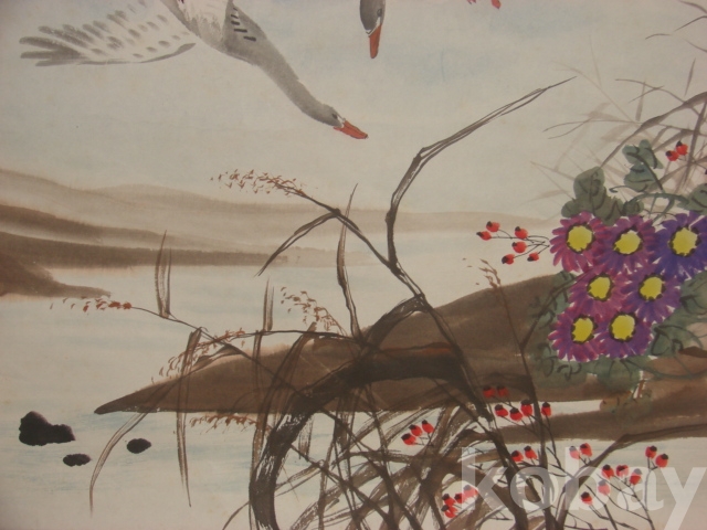 <노안도>: 기러기는 동양의 옛 산수화에 있어 가을 경치를 대표하여 ‘소상팔경도’ 가운데 ‘평사낙안(平沙落雁)’이 포함되기도 한다. 노안도(蘆雁圖)의 노안을 노안(老安)과 같은 의미로 여겨 노후의 안락함을 기원하는 그림으로도 그렸다.