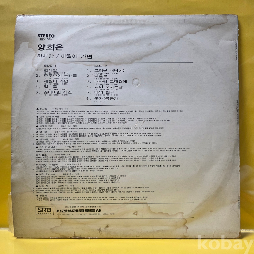 | 자켓상태 | EX : 약간의 마모, 모서리 찢김 존재 | 음반상태 | EX : 재생에 영향 없는 가벼운 기스 존재 | 발매정보 | 초반 | 가사지여부 | 무 |