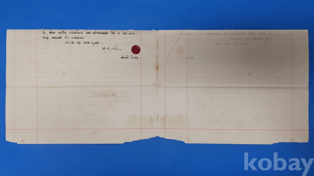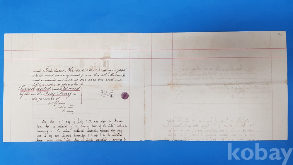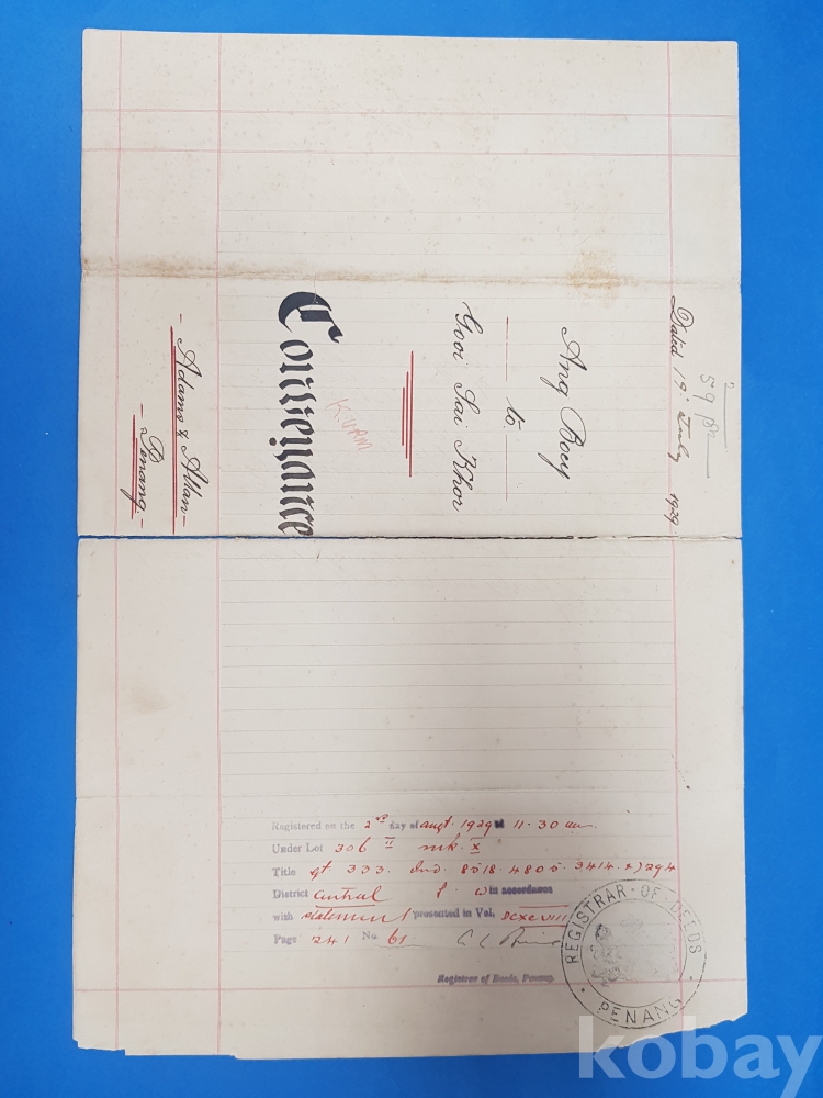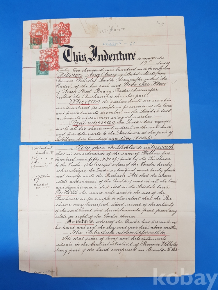 **** 1929년 영령 해협식민지 $2 2매, 50c 우표첩부 PENANG 대형문서/*가운데 접힌부분 찢어짐