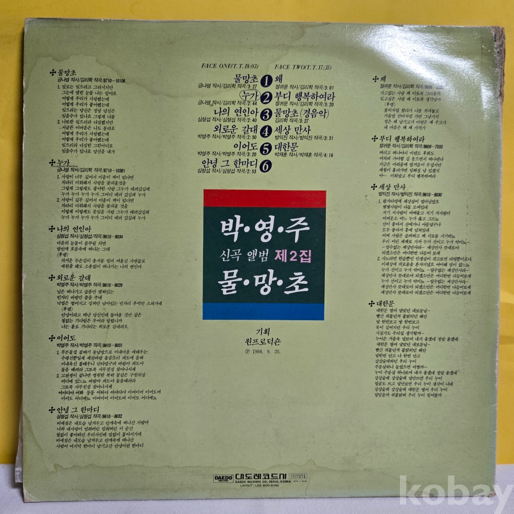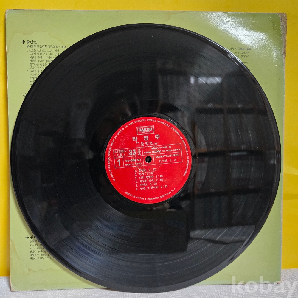 | 자켓상태 | VG : 주름, 접힘, 모서리 찢김 다수 | 음반상태 | VG : 생활 기스 다수, 가벼운 노이즈 존재 | 발매정보 | 초반 | 가사지여부 | 무 |