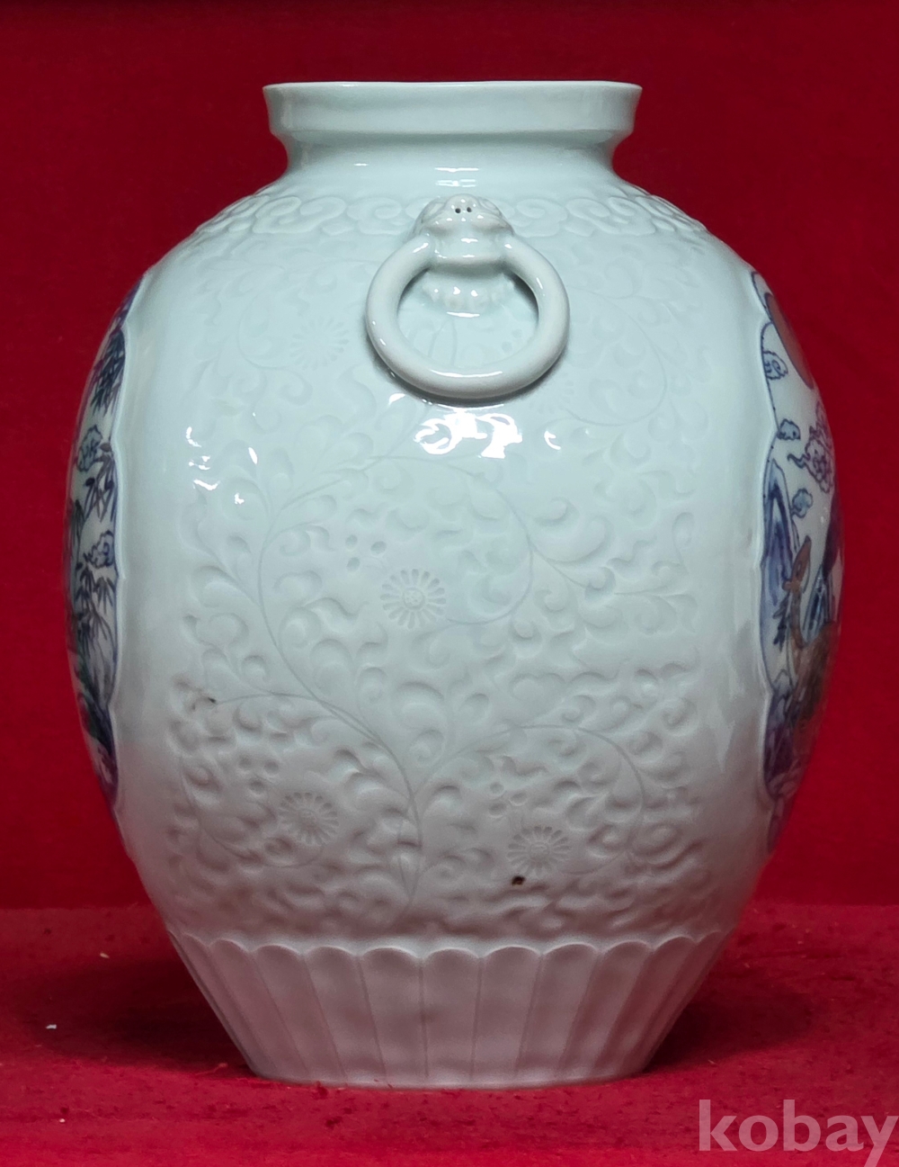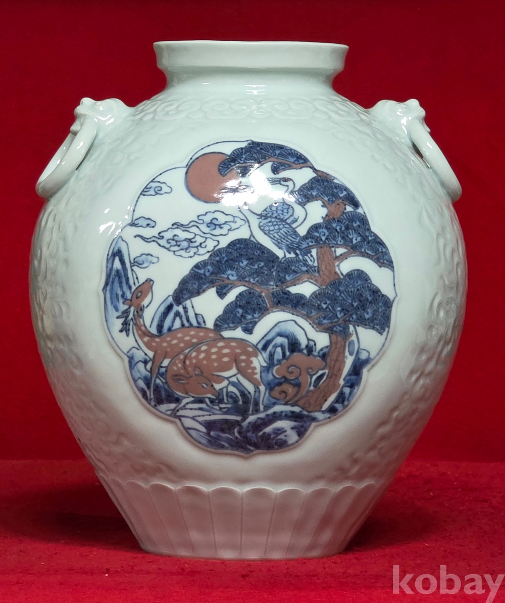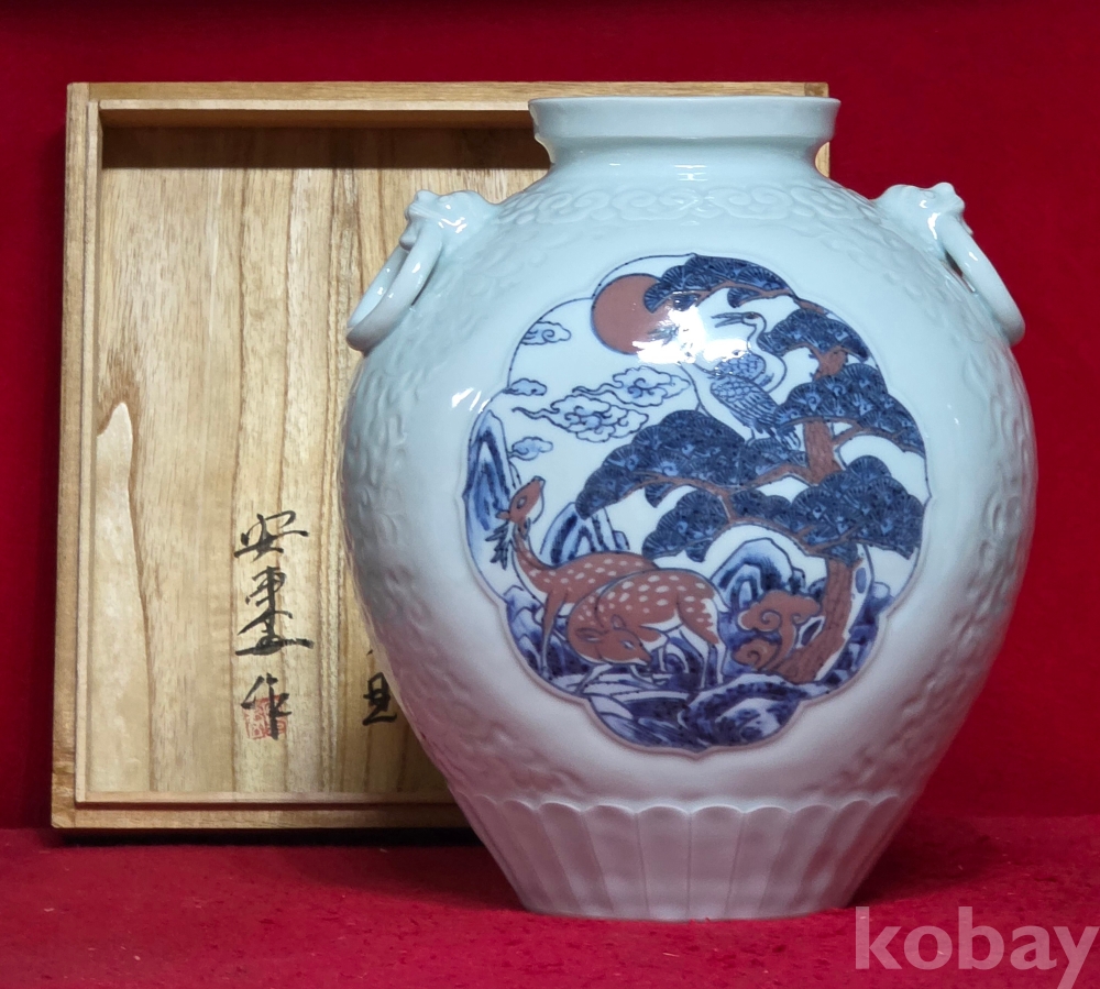인간문화재 호산 안동오 선생님의 청화백자 철화 진사채 십장생 양이오 편병 대형 입니다