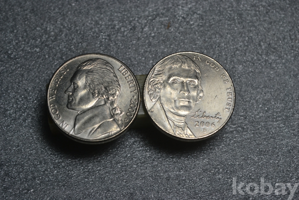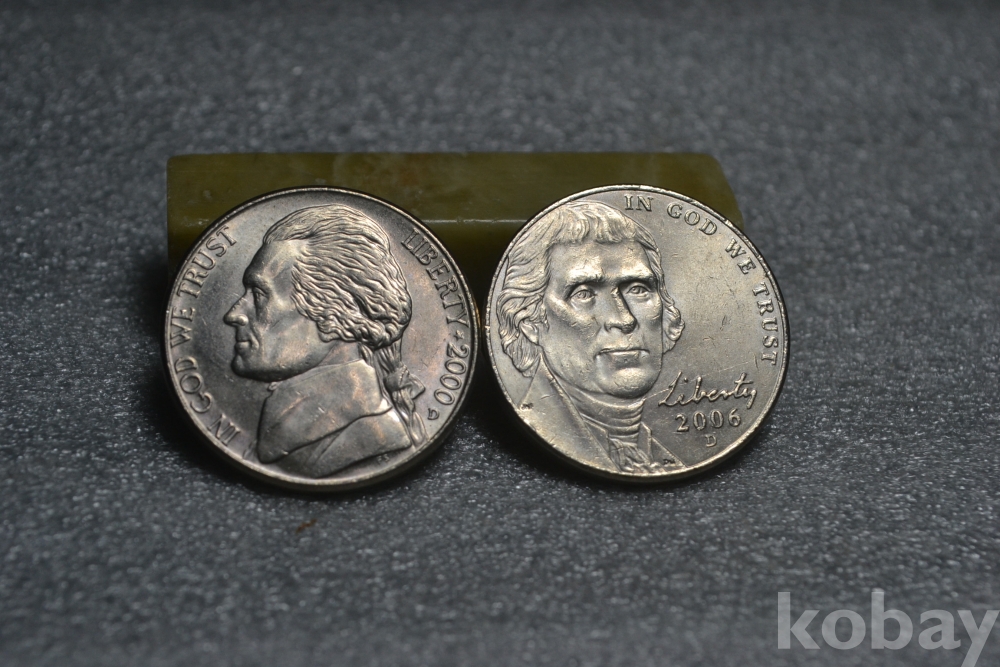 오래된 2000년도 (D) , 2006년도 (D) 발행된 아메리카 미국 3대 대통령인 토머스 제퍼슨 인물 도안의 5센트 주화 입니다. (사진참조)