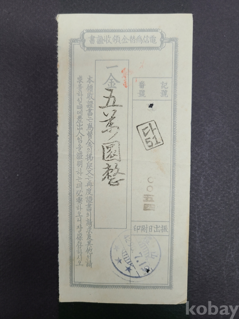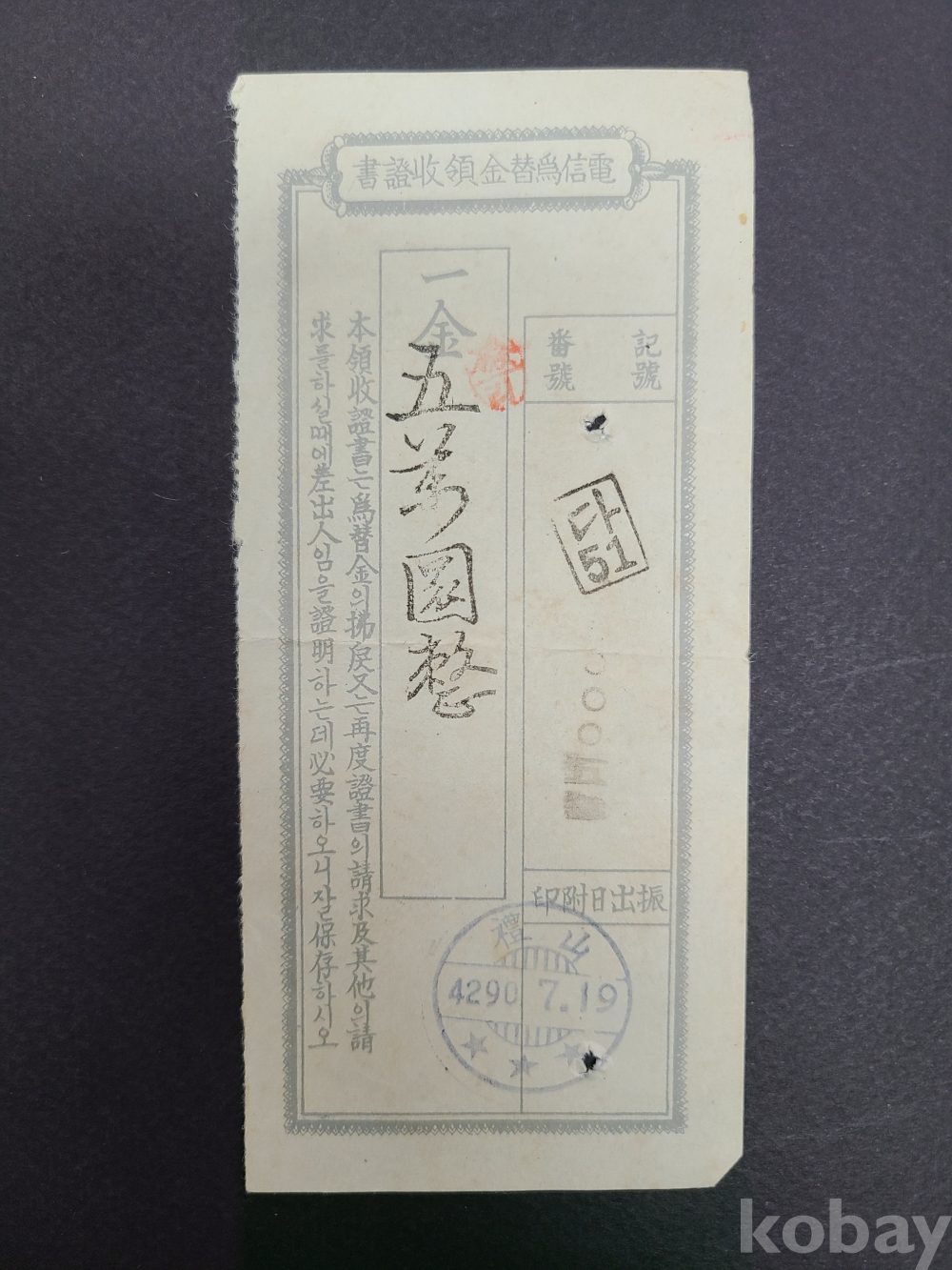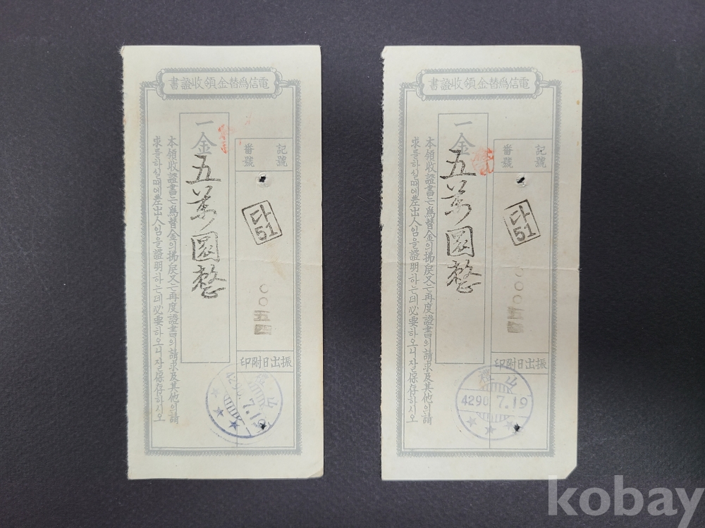1957년 전신위체금영수증서 2부(예산,4290.7.19,진출일부인)