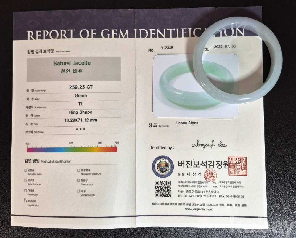 공신력있는 종로3가의 버진보석감정원에서 2020년 7월에 감정 받은 것으로 100% 천연비취 진품이니 감정서를 자세히 보신뒤 입찰 하시고, 낙찰 받으신 분에게는 당연히 감정서도 같이 발송해 드립니다.