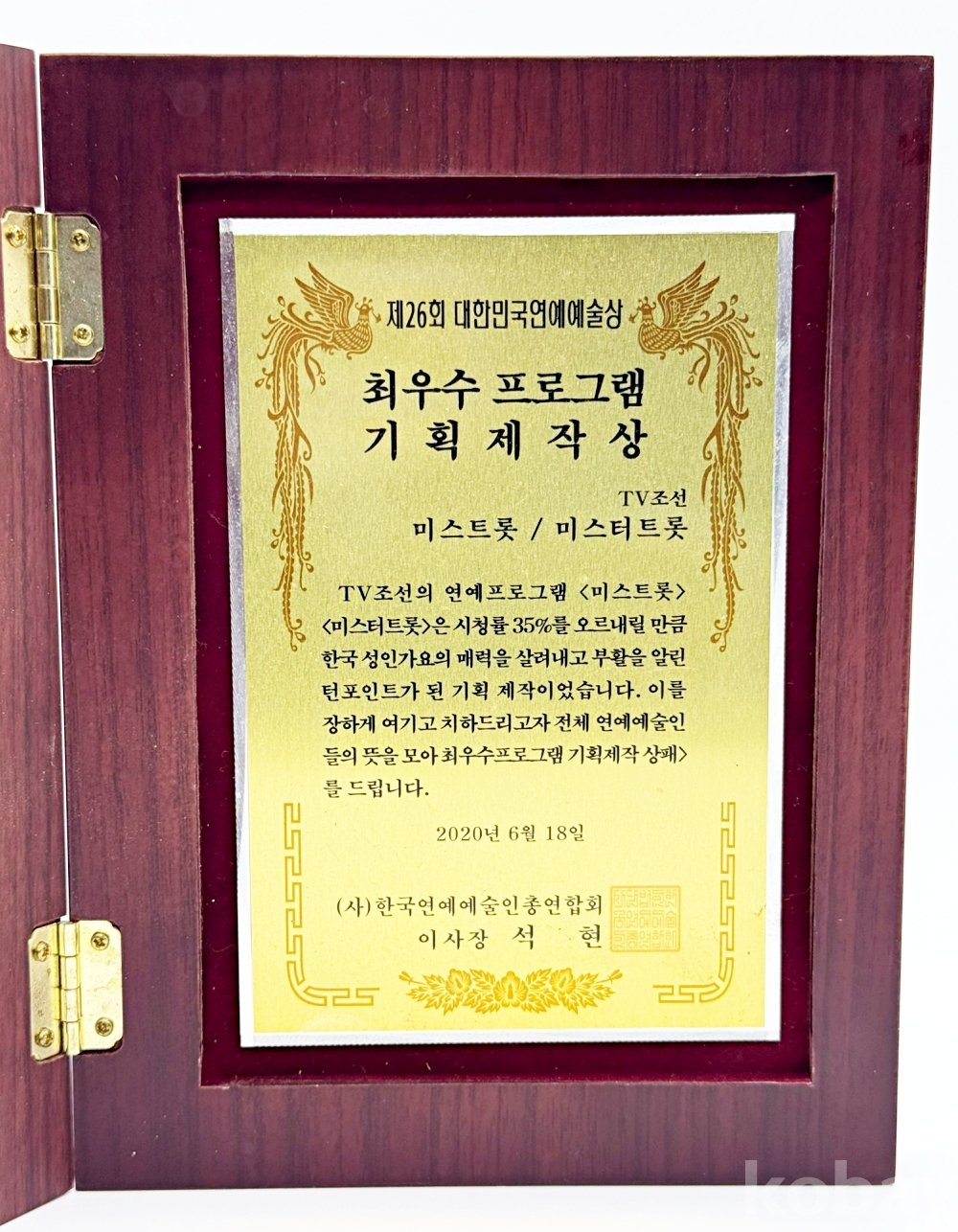 상품설명 | 수상 프로그램은 TV 조선의 연예프로그램 <미스트롯>과 <미스터트롯>이다. 당시 35%의 높은 시청률을 기록한 인기 프로그램으로 기획제작상을 수상하였다. | ||