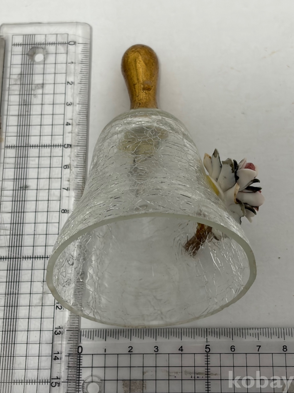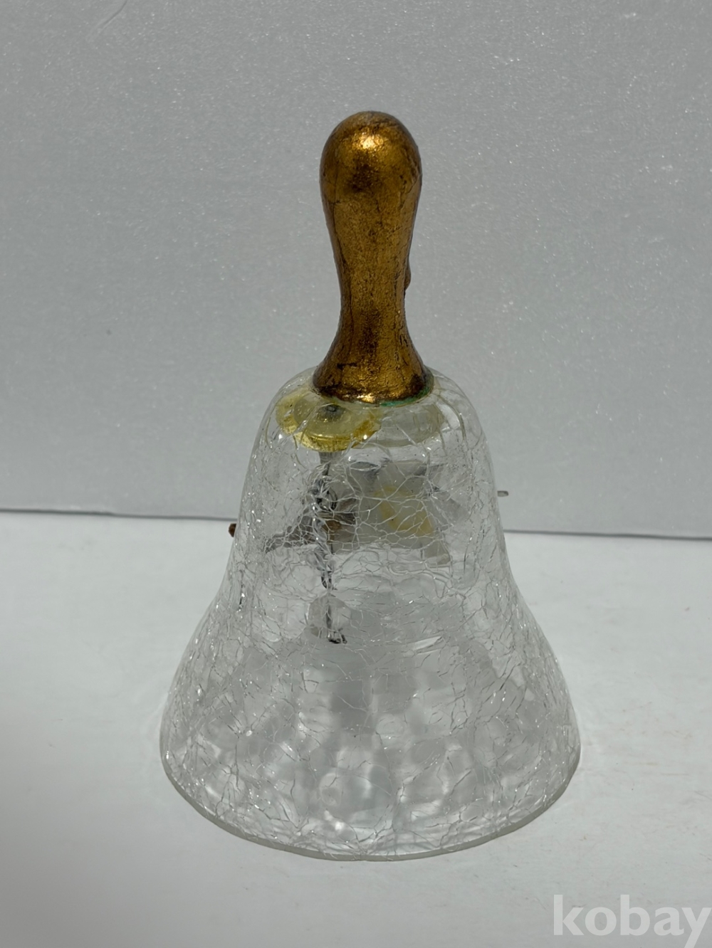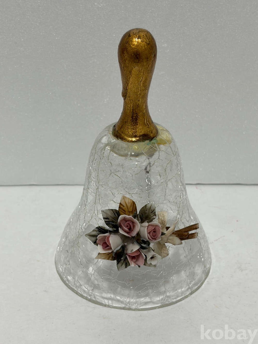 금색 손잡이와 도자기 꽃 장식 및 크랙 처리된 유리 종입니다.