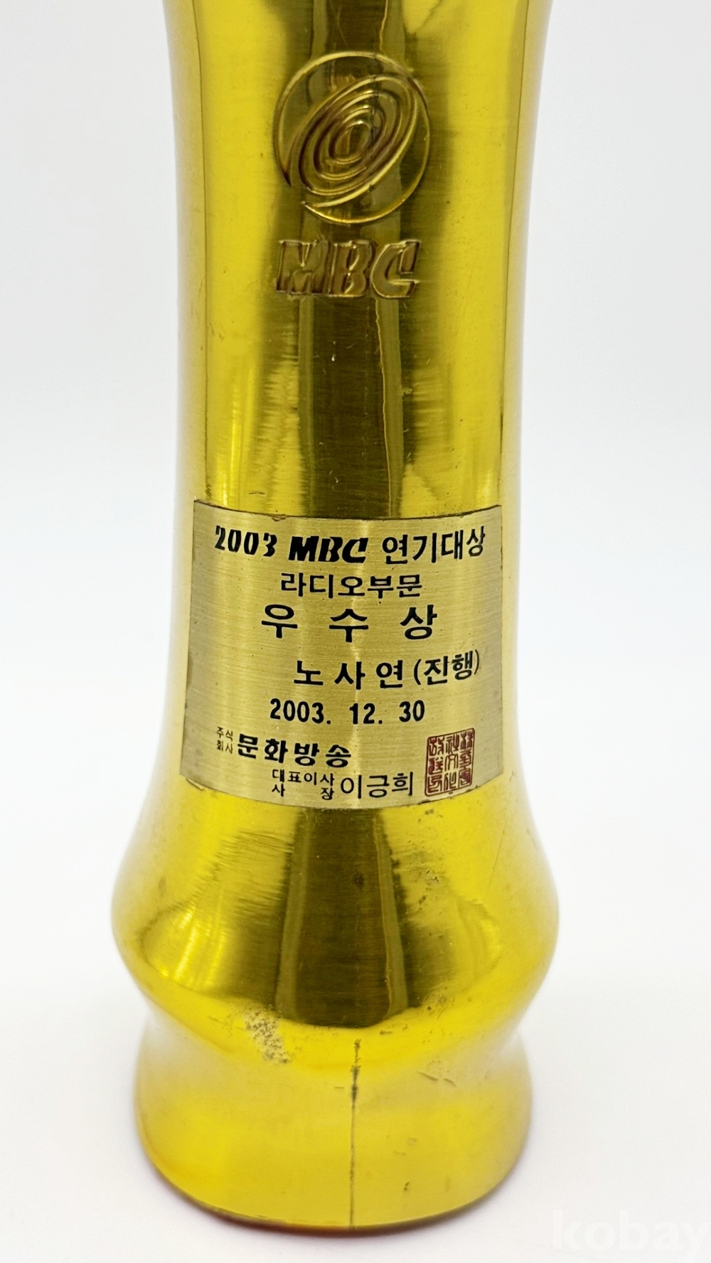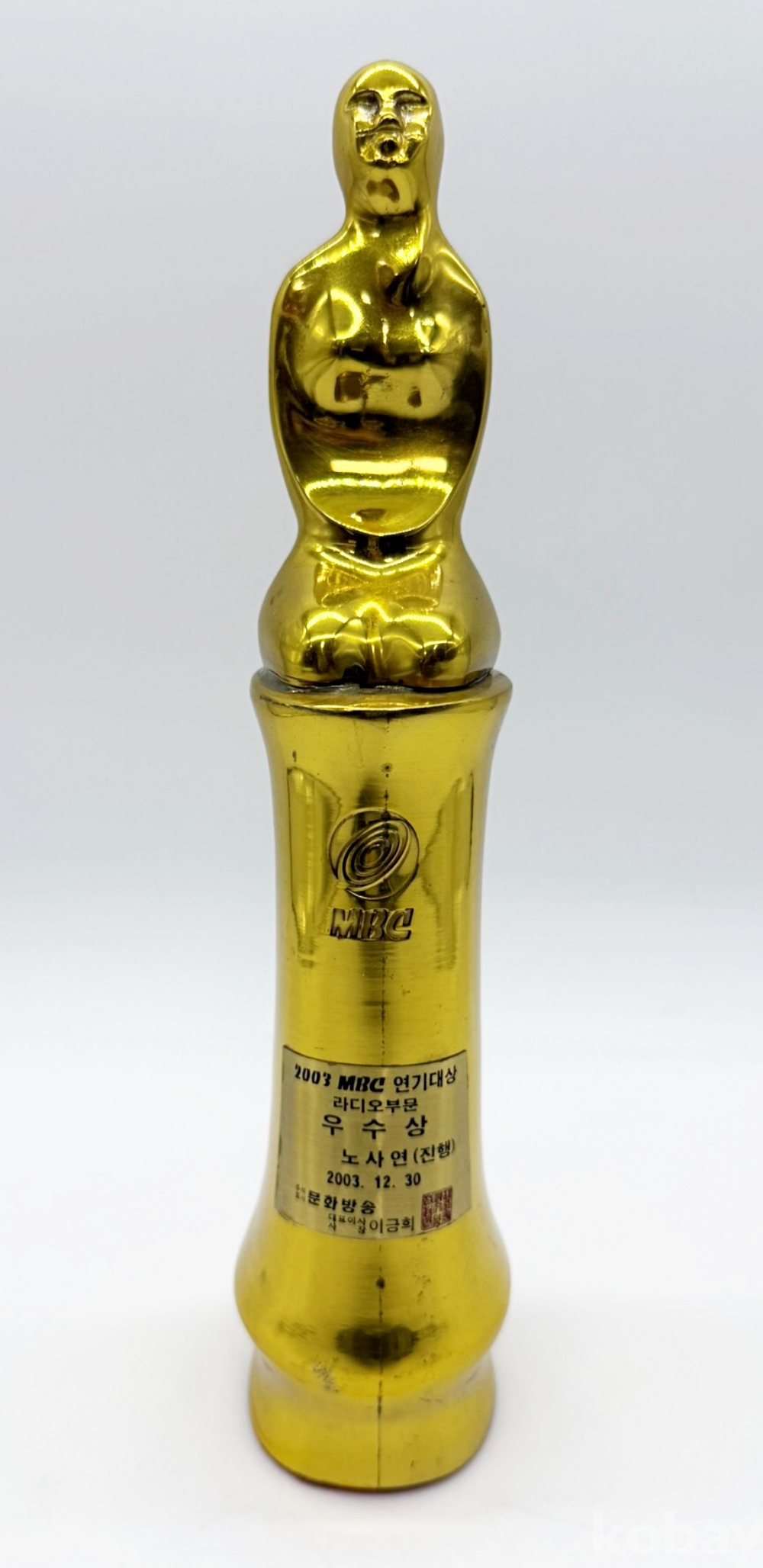 상품설명 | 2003년 MBC 연기대상 라디오 진행 부문 '우수상 트로피'이다. 수상자는 '이택림·노사연의 즐거운 오후 2시' 진행자 노사연으로 유쾌한 입담과 재치로 많은 청취자들의 사랑을 받았다. | ||
