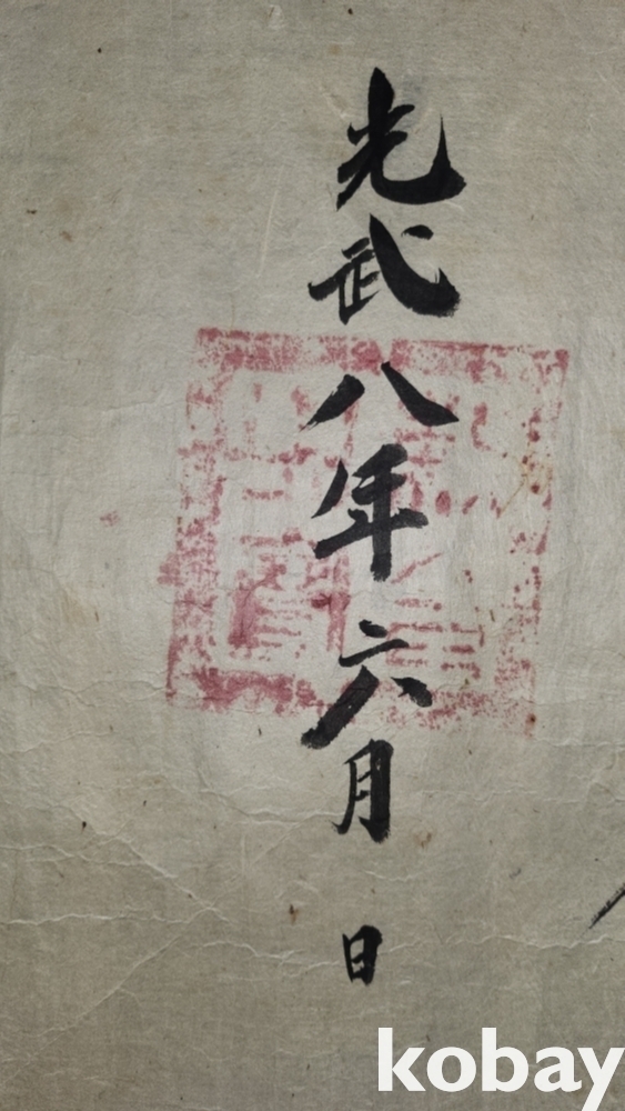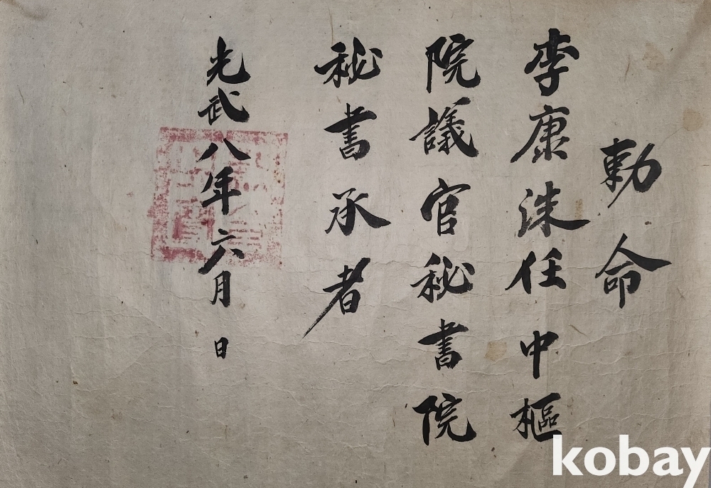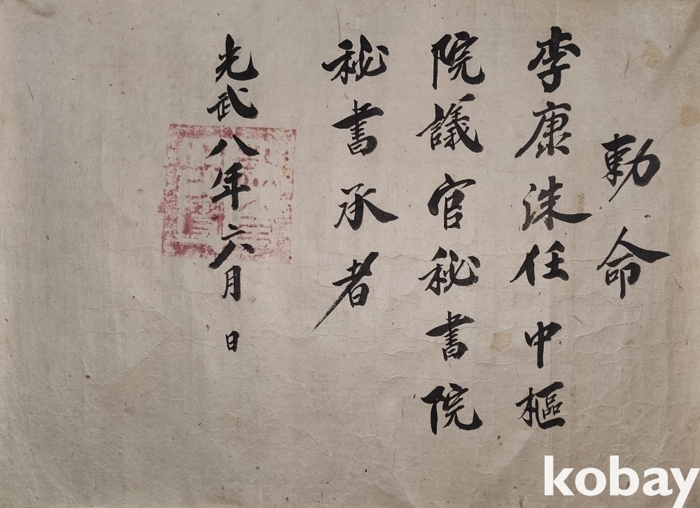 광무8년( 1904년고종41년)발행 칙명으로 장지에 이강수 임중구원관필서원 의내용이 보입니다