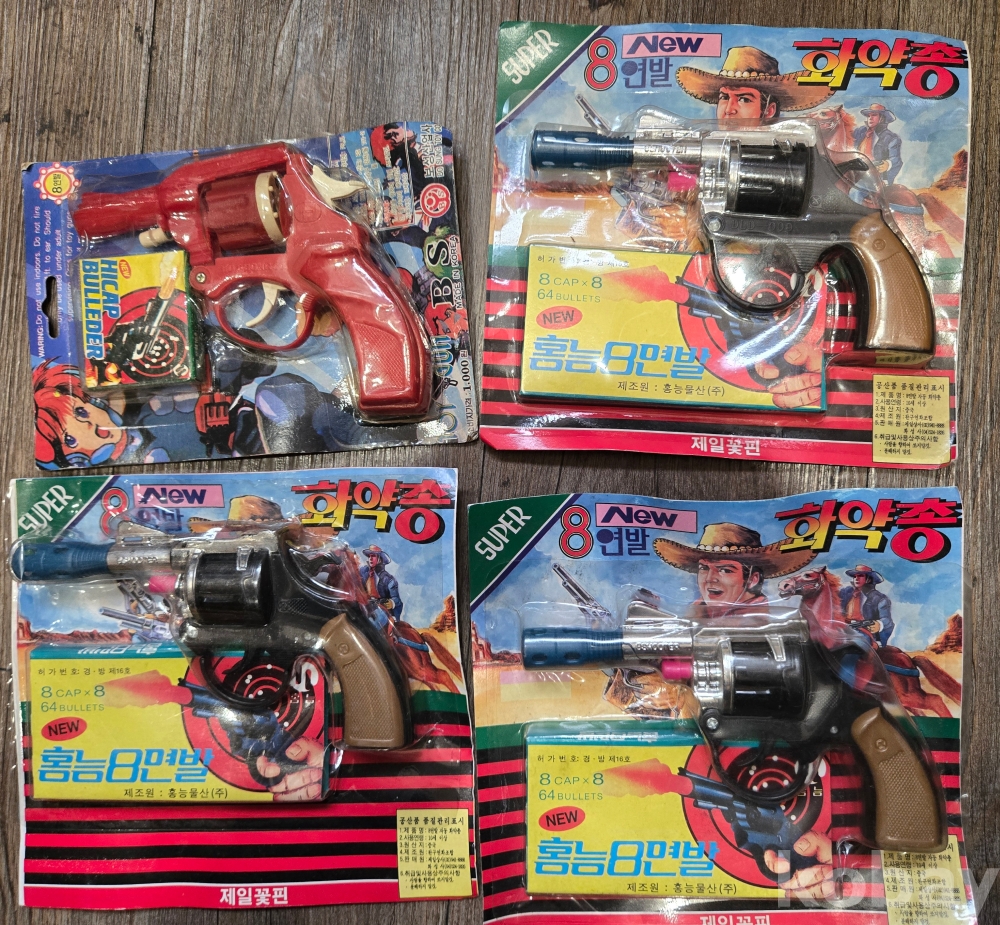 옛날 문방구에서 팔던 화약총 입니다 총 네개이며 당연히 희귀하고 상태는 좋은편입니다