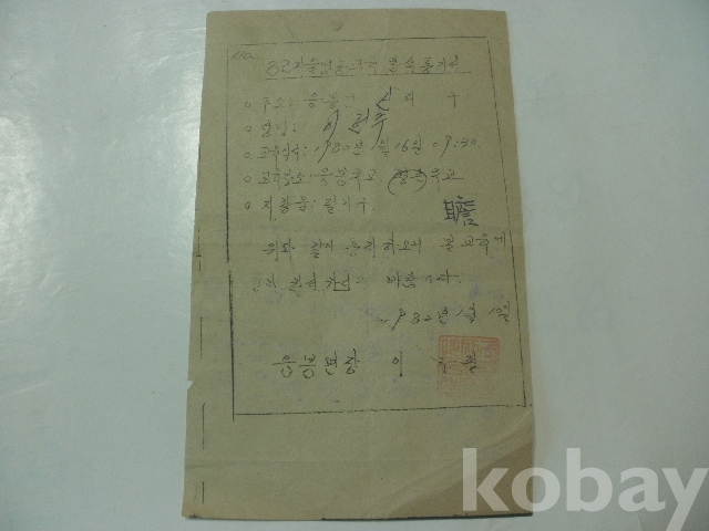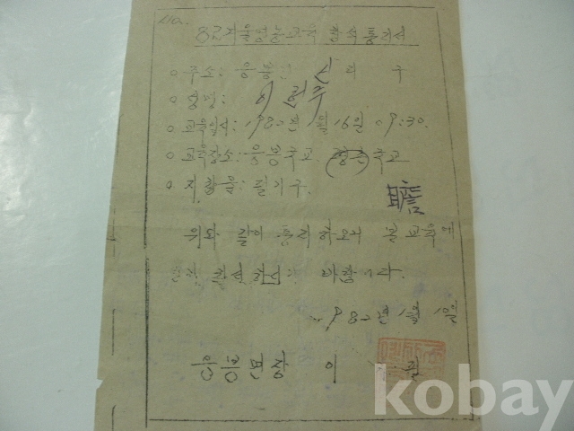 겨울 영농교육 - 참석 통지서 (1982년, 응봉면장)