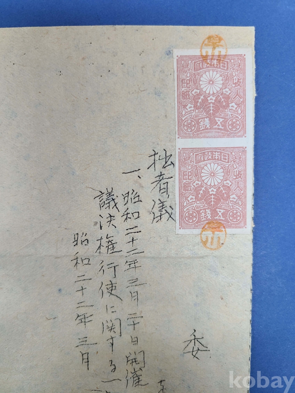 일본 1947년 5전 무공수입인지 2매첩부 니카다현상공업협동조합창립총회 의결권행사 위임장