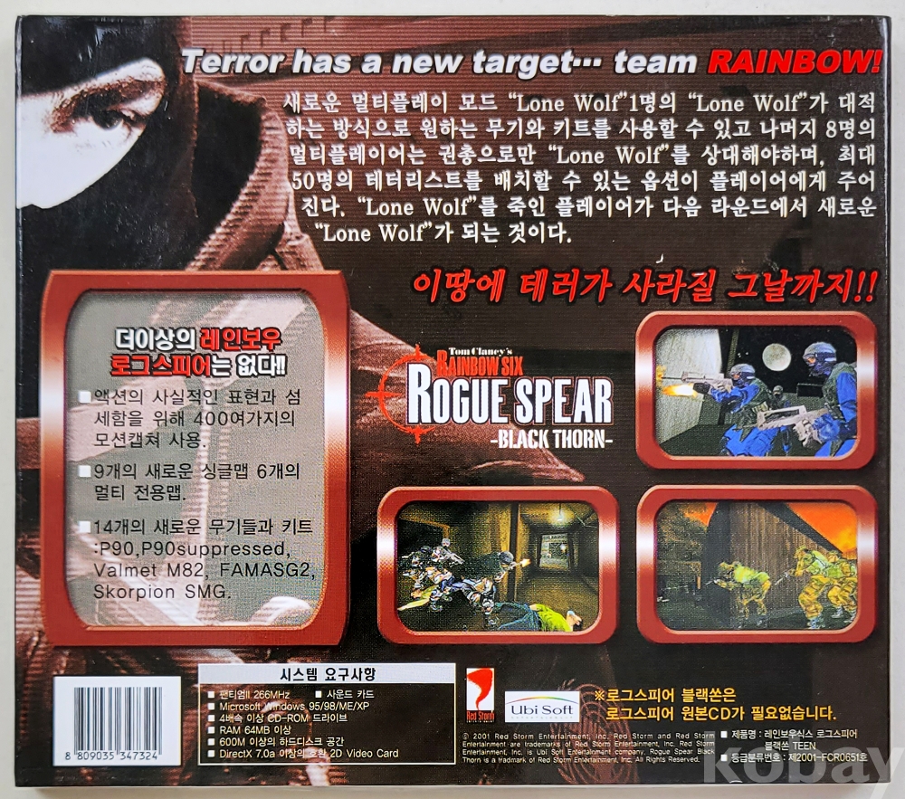 물 품 명 | 게임CD / CD 미개봉 / 레인보우식스 - 로그스피어 : Black Thornx(Teen) / 2001년 / 유비소프트 |