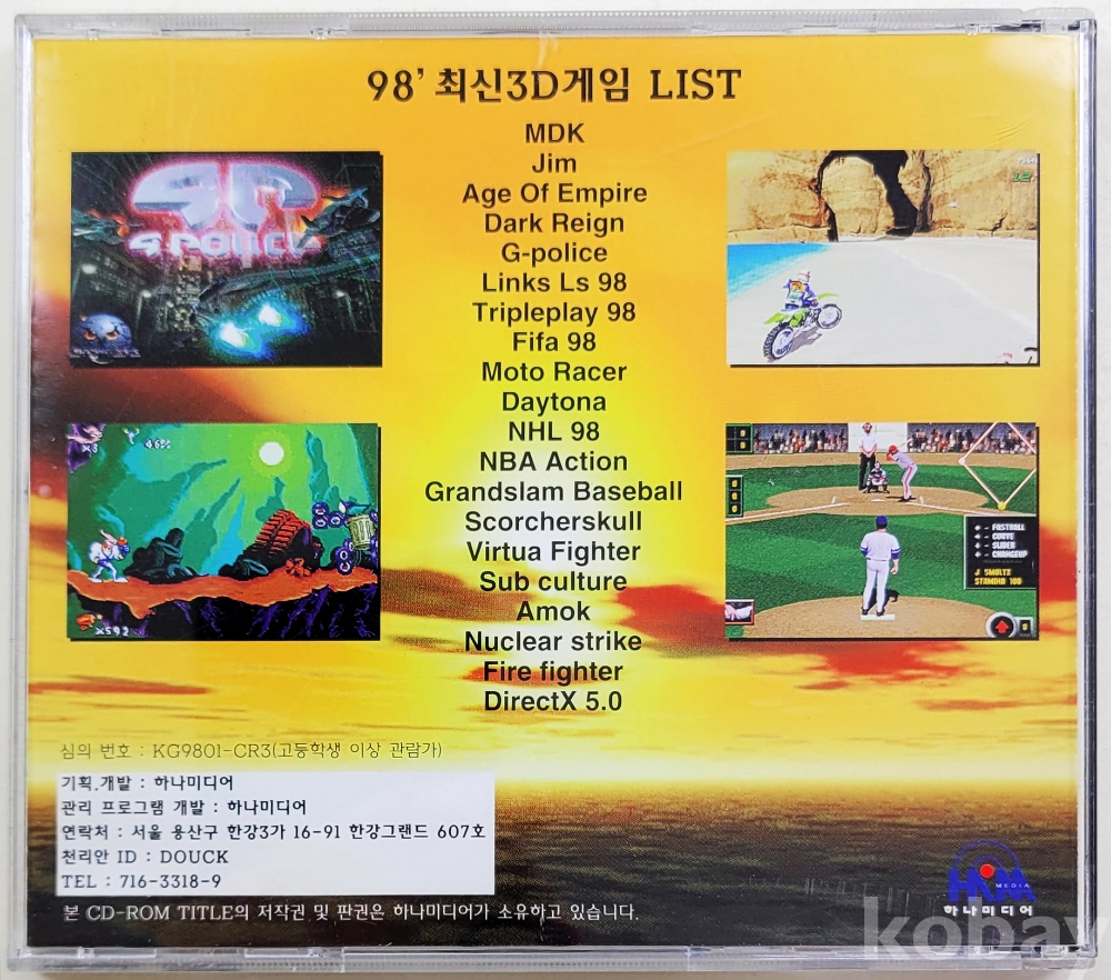 물 품 명 | 게임CD / 98 최신 3D게임 / 연대미상 / 하나미디어 |