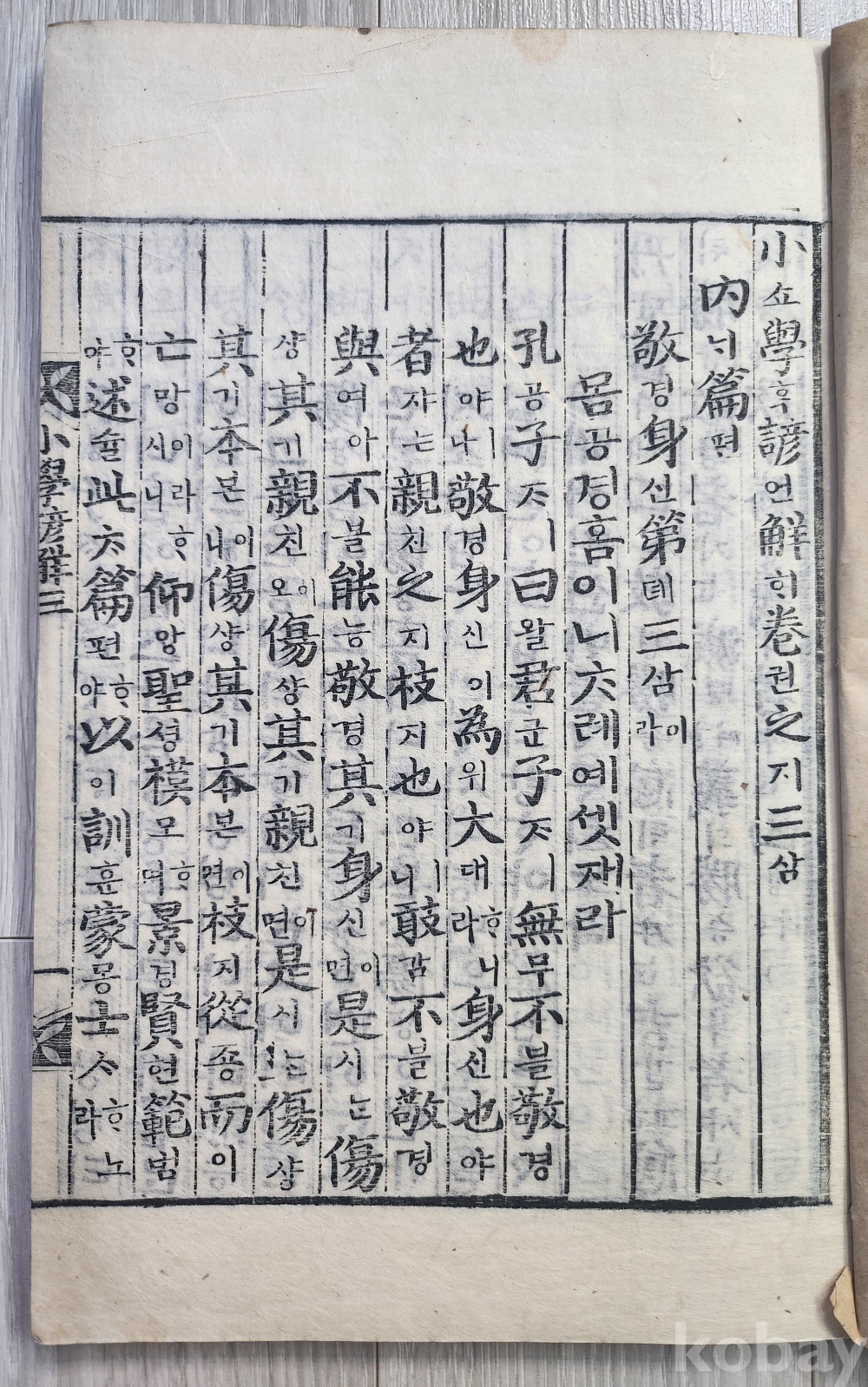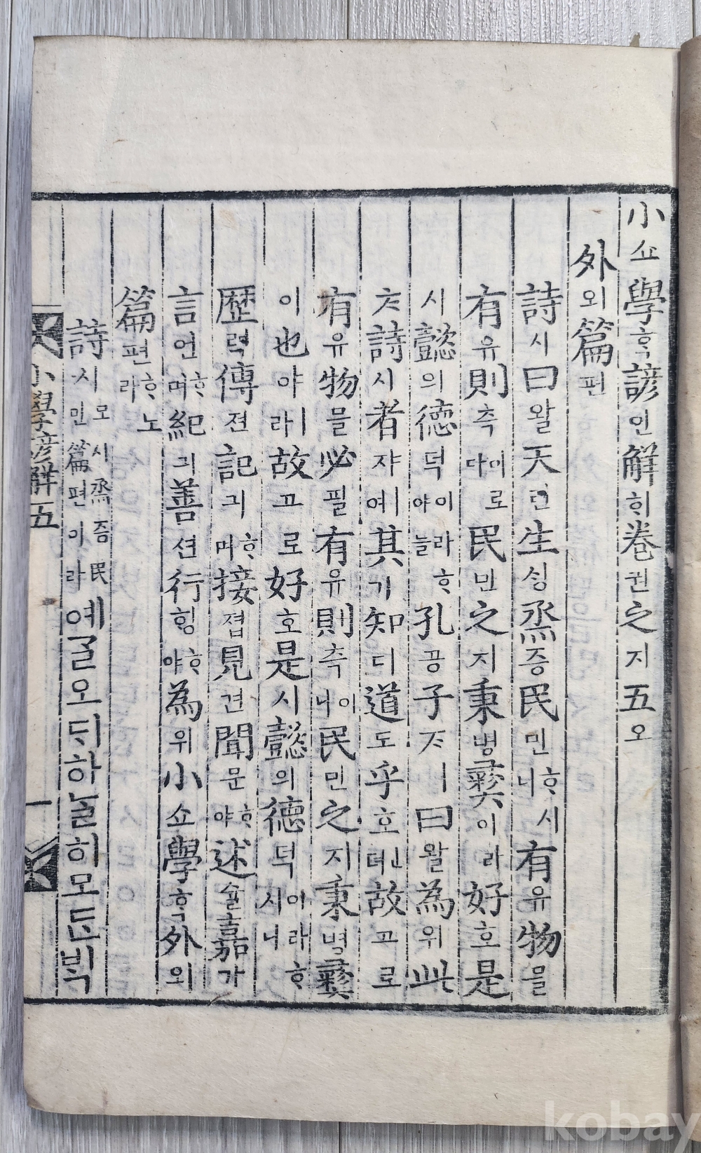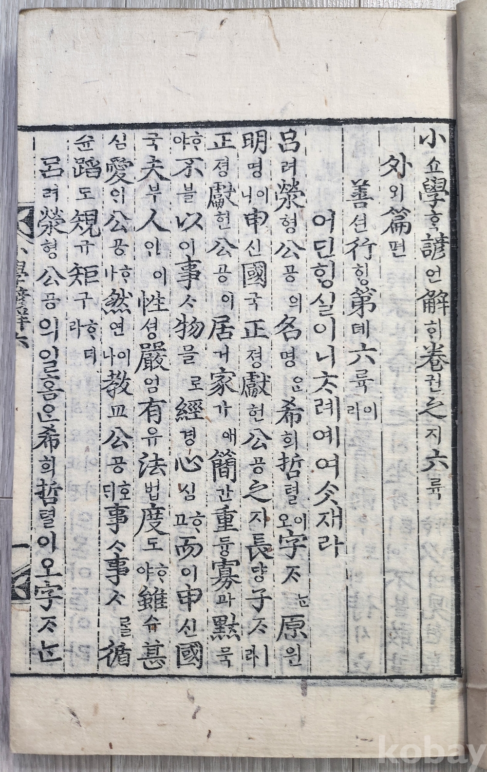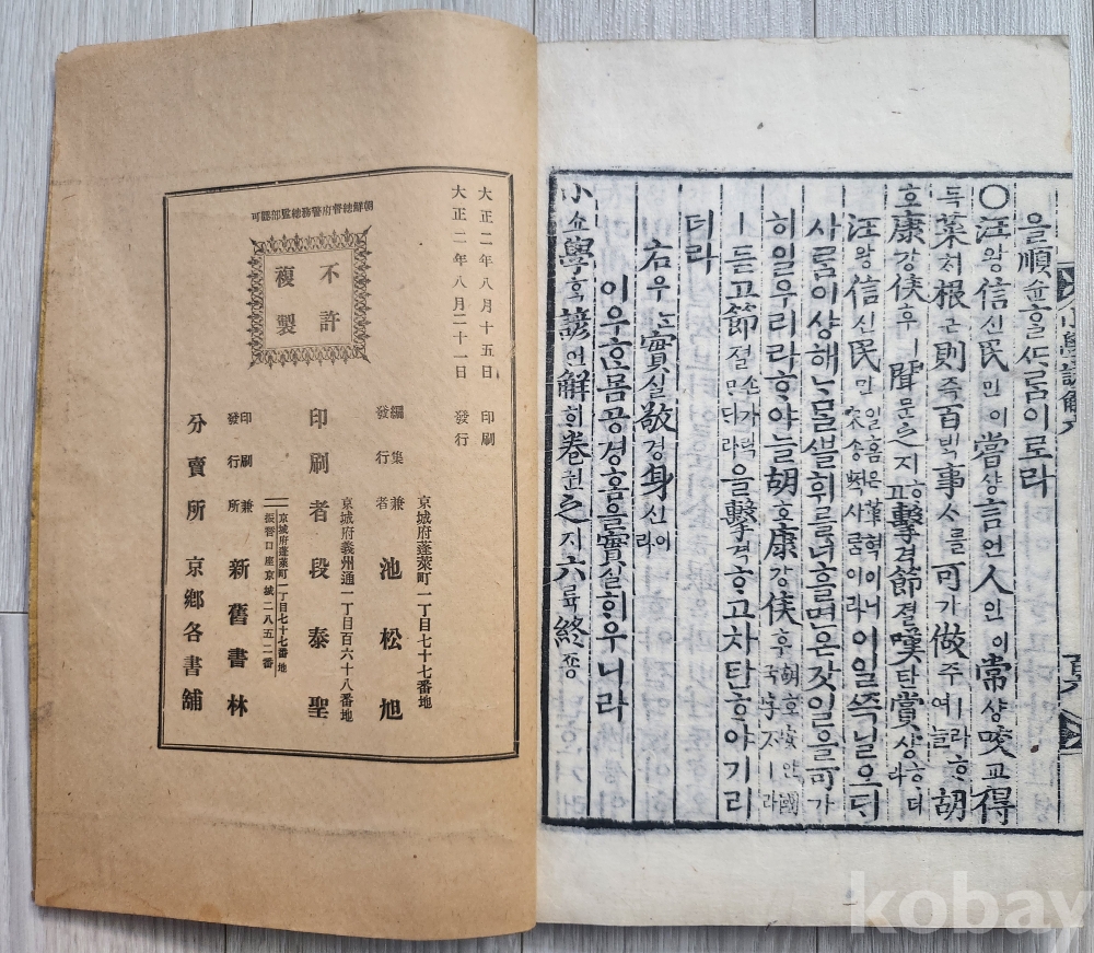 1913년 소학 언해본 6권5책 완질 입니다(목판본) 3,4권이 1책으로 되어있어 5책 입니다 경성발행본 글씨선명하고 상태 매우 양호합니다