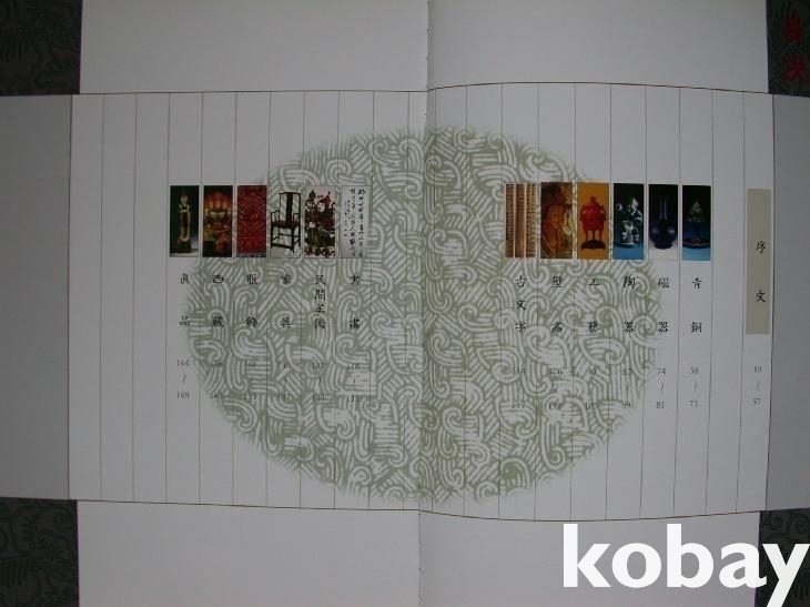 <전언(前言)>으로 긴 해설 소개문이 있다. 목차는 청동, 자기, 도기, 공예, 벽화, 고문자, 서화, 민간미술, 가구, 복식, 서장, 진품으로 나뉘어 있다. 각 부분마다 대표 유물 몇 점씩 수록하며 간단한 설명을 붙였다. 뒤의 서장은 '티벳의 공예품들'이라는 별도의 제목을 달았고, 제12부분인 진품은 주로 청동기, 용(俑), 불상 등으로 일본 소장품(마지막)도 있다.