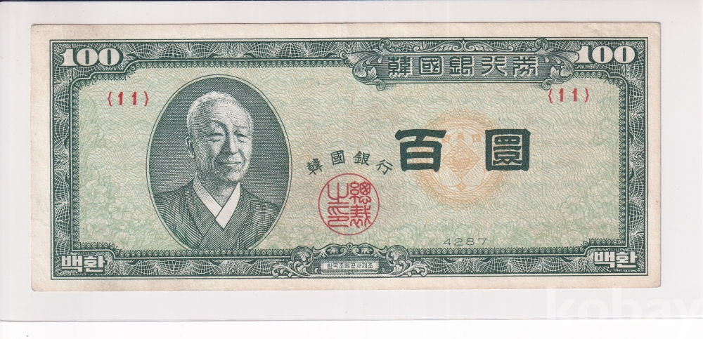-희귀- 특년 4287년(1954년) 좌이박 신 백환 백색지 판번호 11번 극미 지폐
