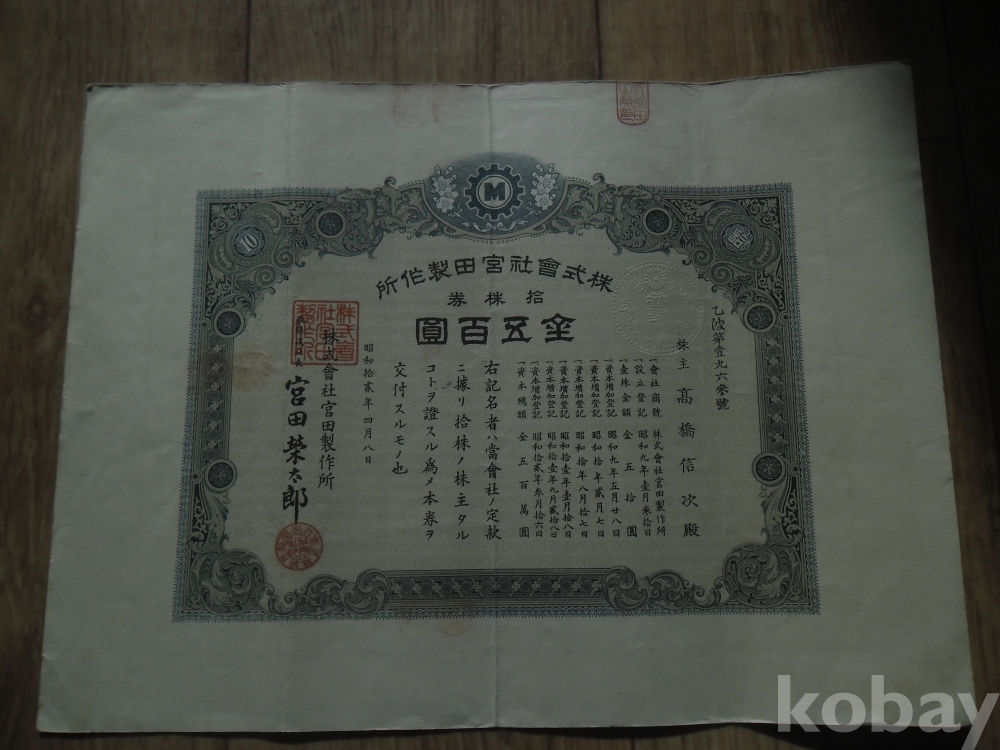 소화12년 발행: 주)궁전제작소 주권(한국인 교부)