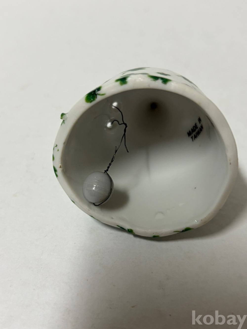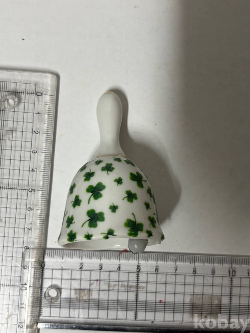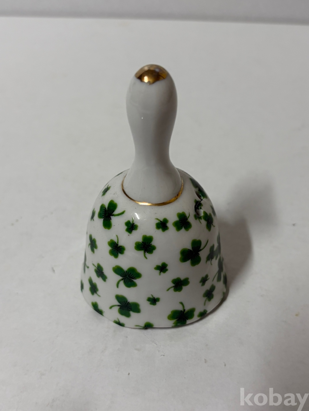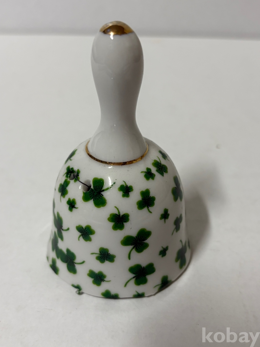 흰색 바탕에 초록색 세잎클로버 무늬가 페인팅되어 있는 도자기 종입니다.