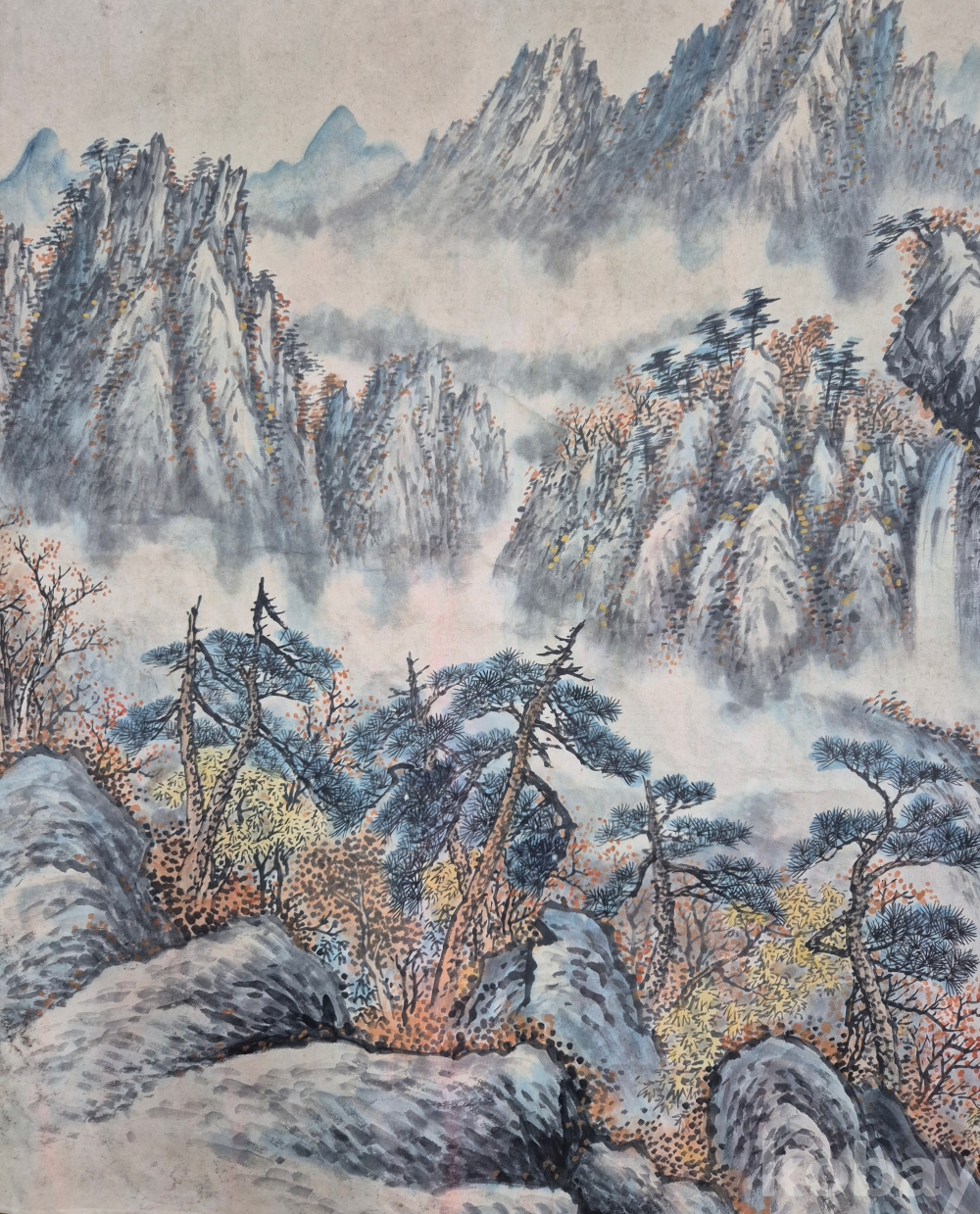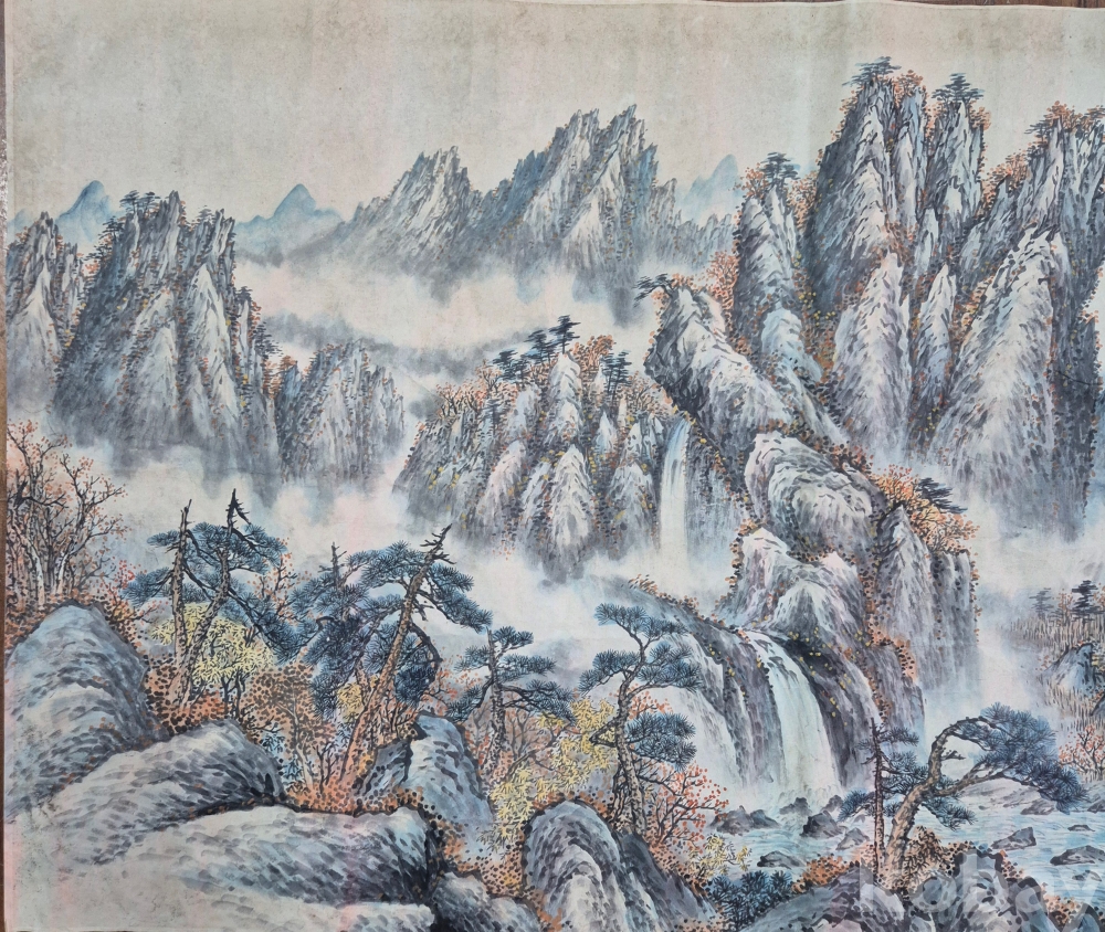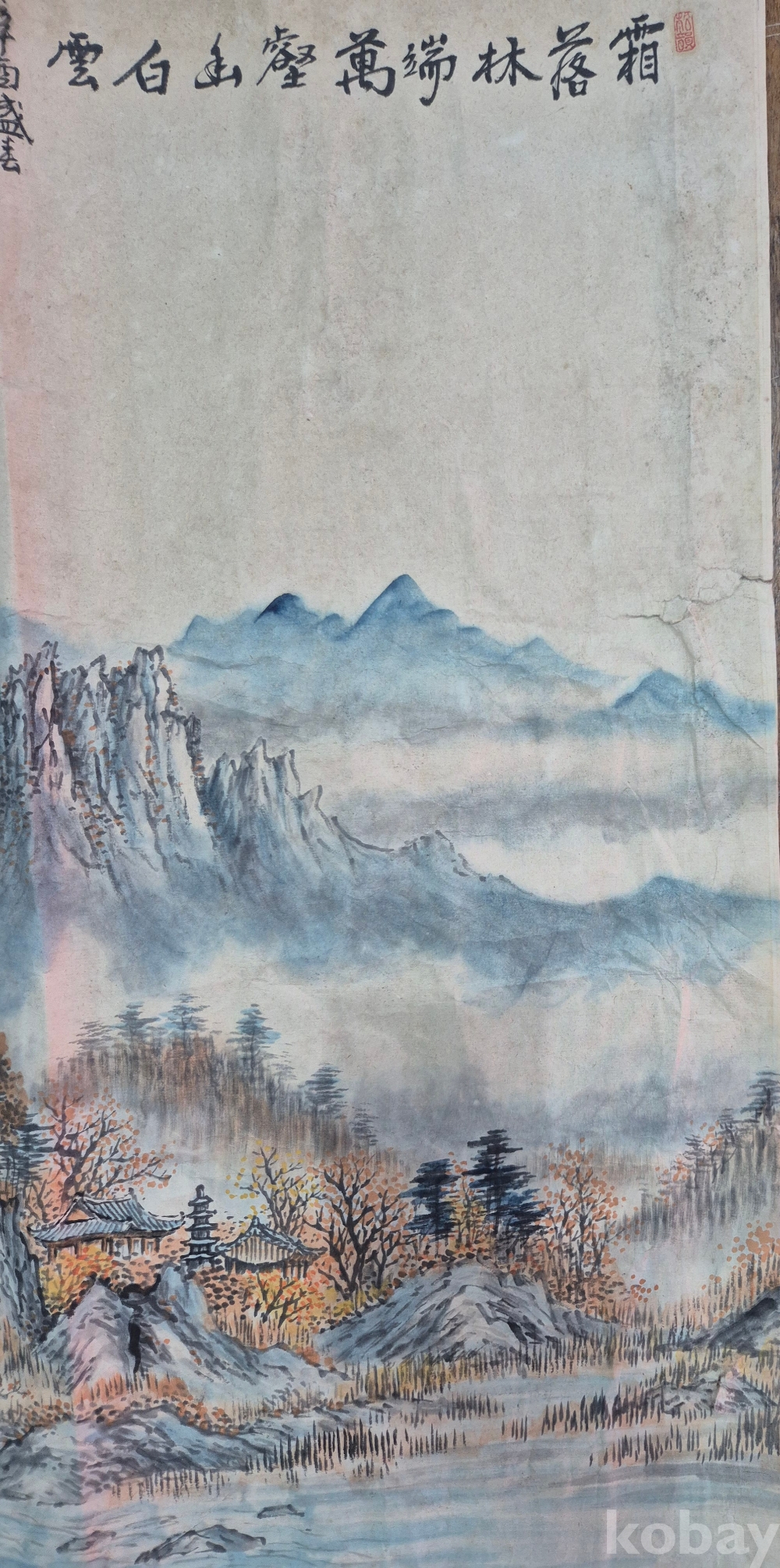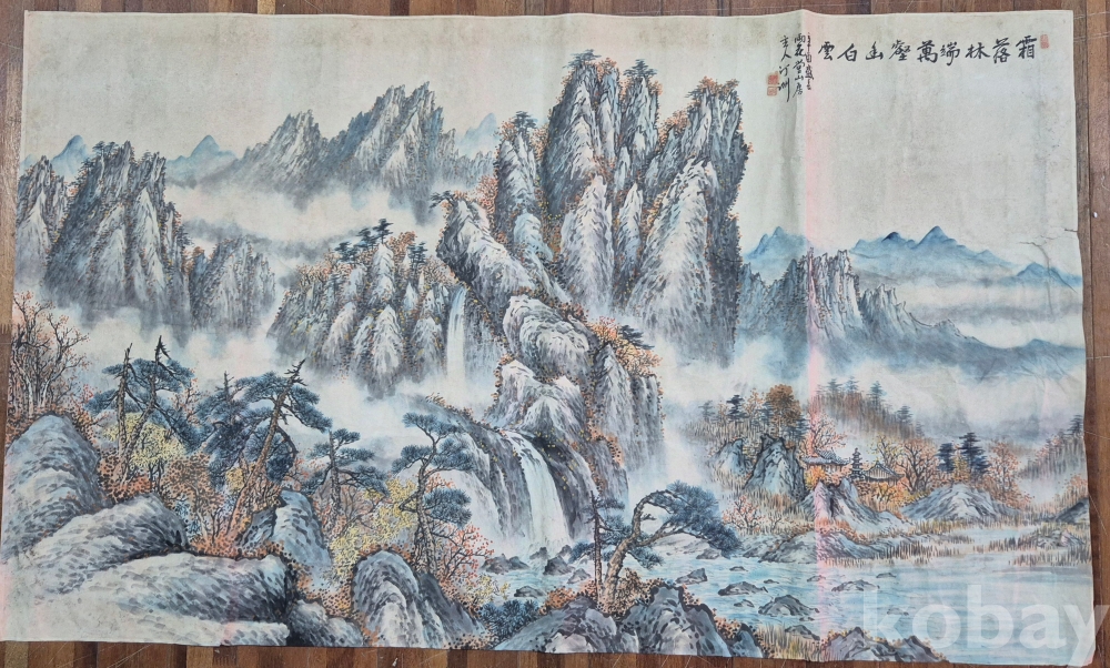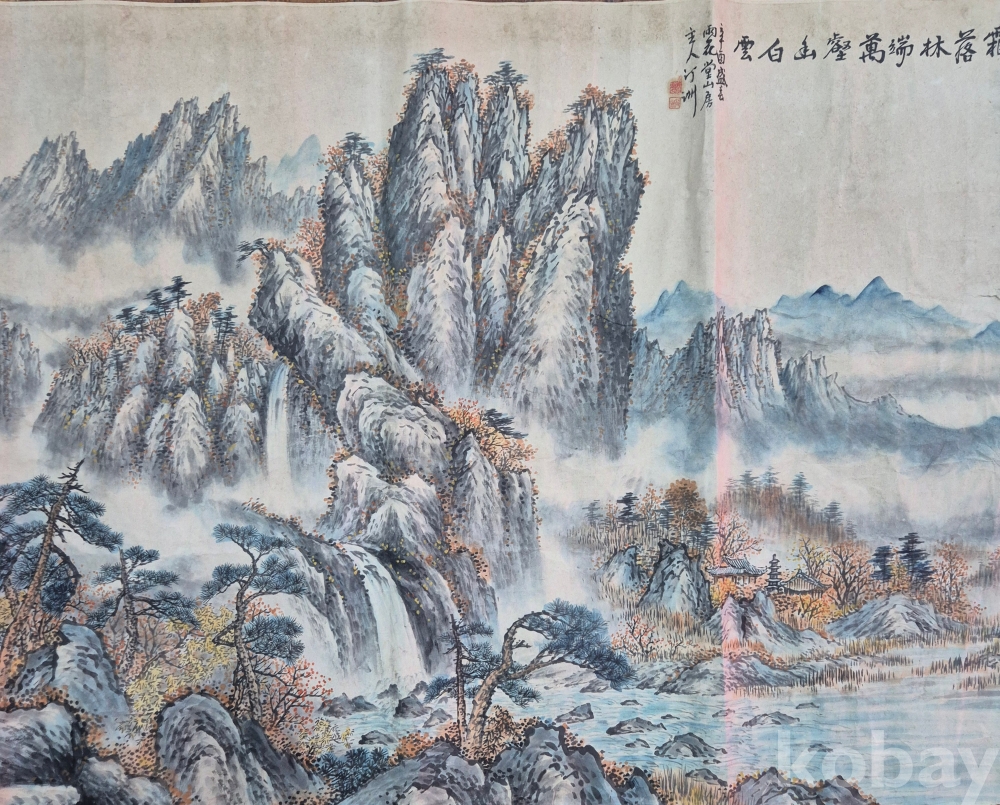 오래된 작품성 좋은 선전작가의 수작 전지크기 대형 추경 산수화'이오니 작품 이미지상 수결 및 낙관'등 두루