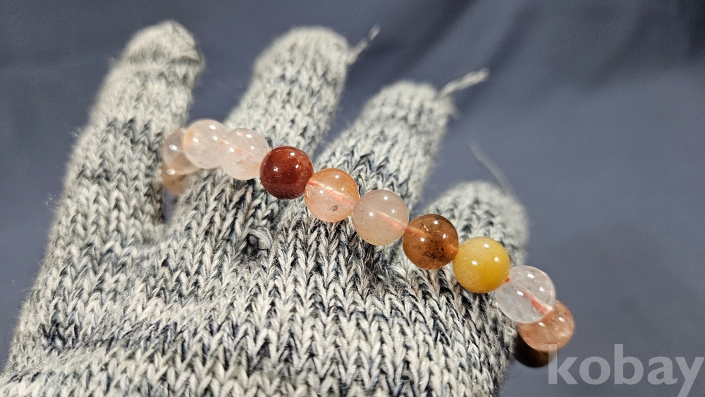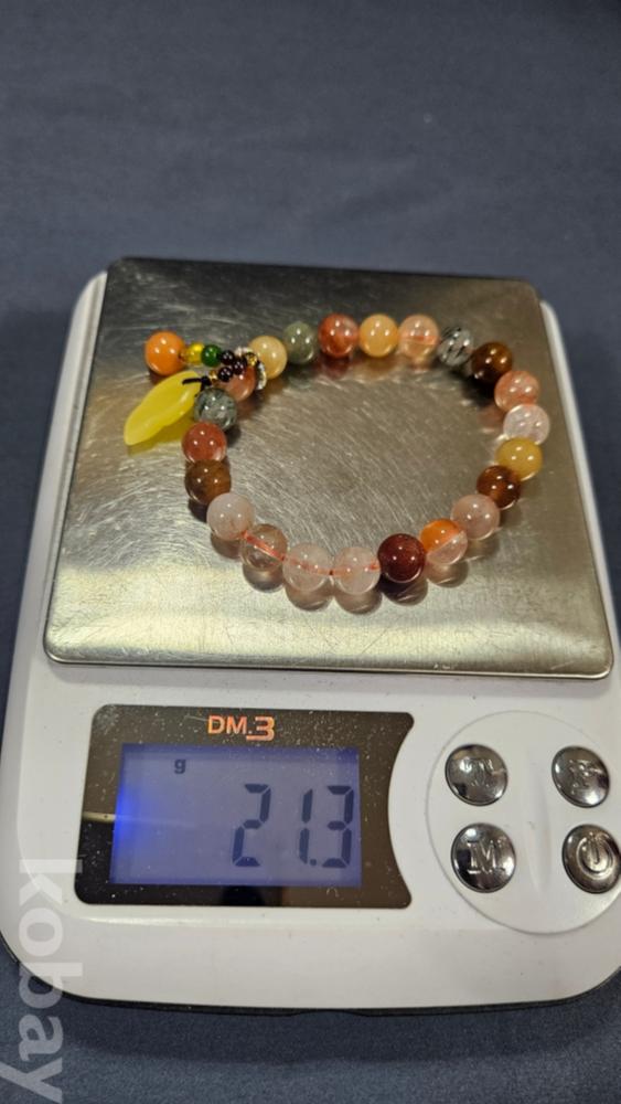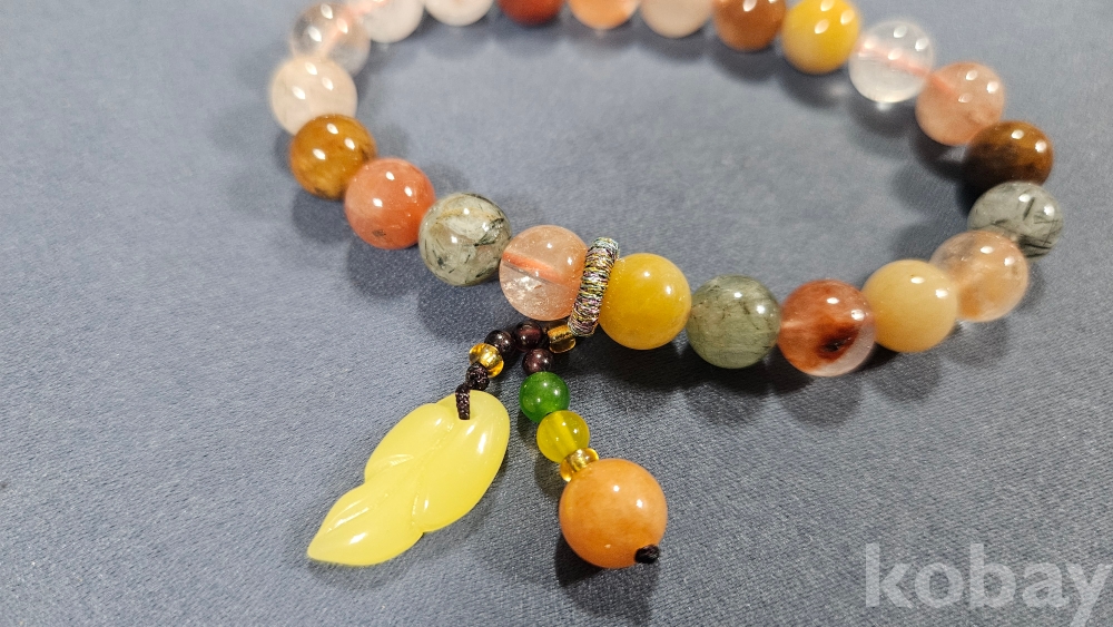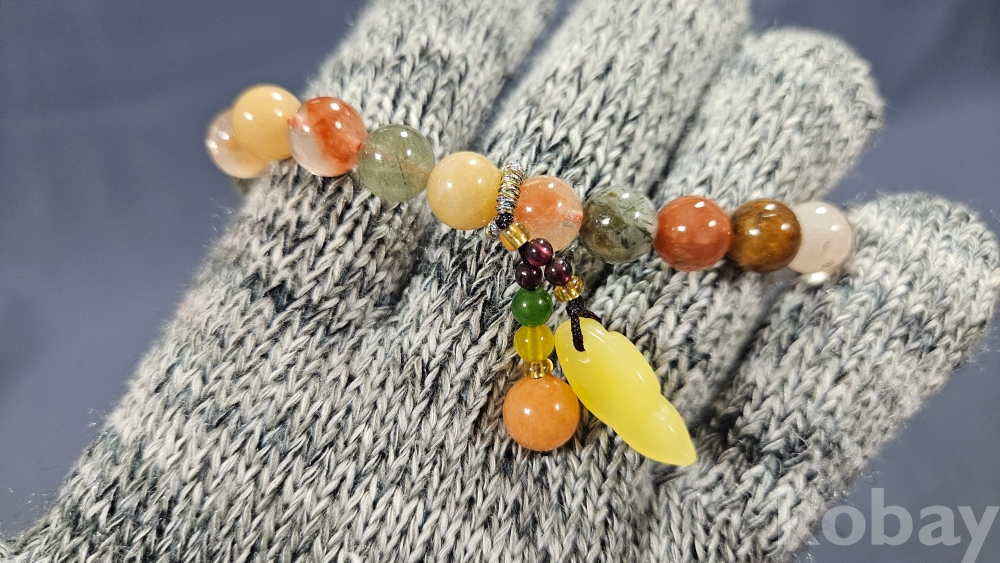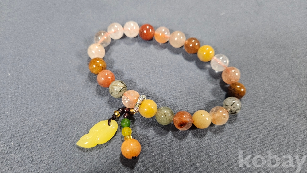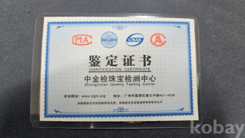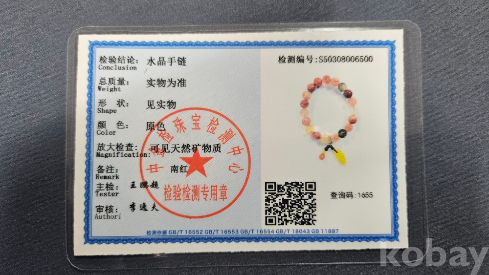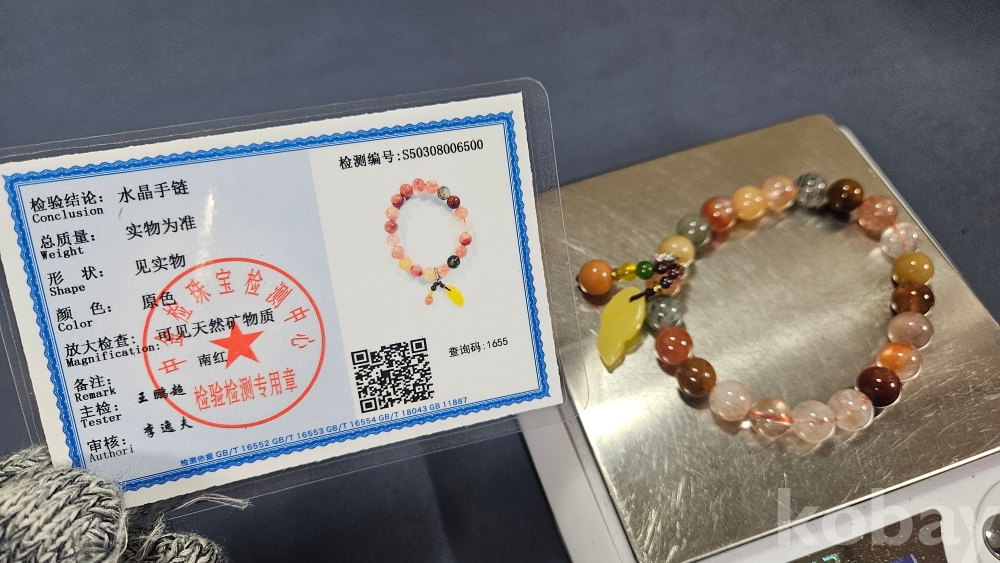 감정서가 포함된 수정과 옥으로 만들어진 팔찌로 보여집니다.