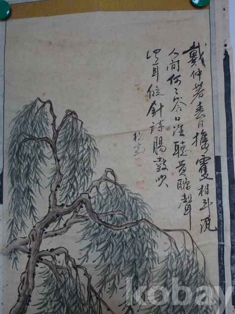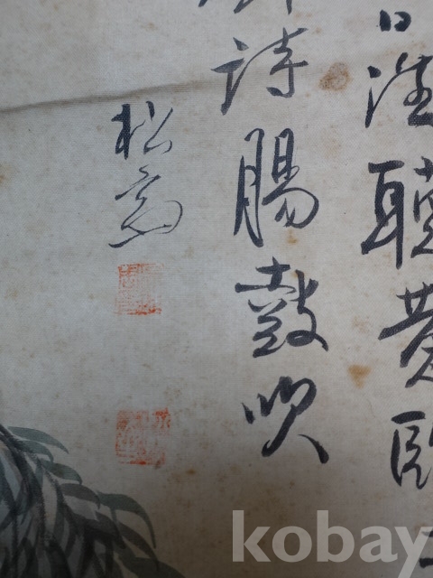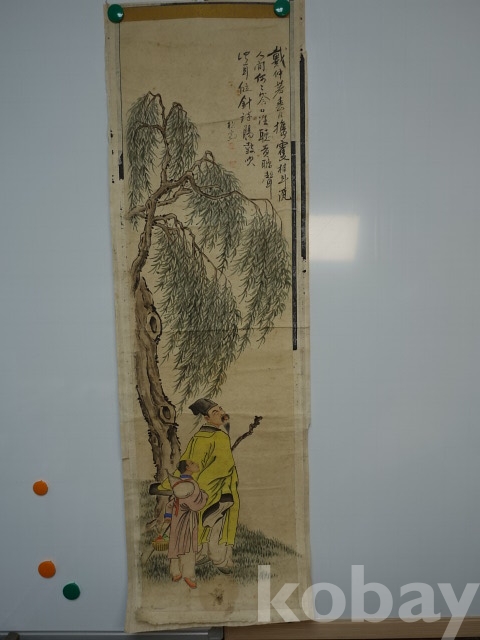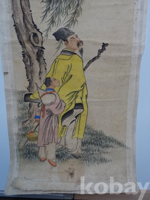 비단에 그린 작품으로 하단에 구멍이 있습니다.