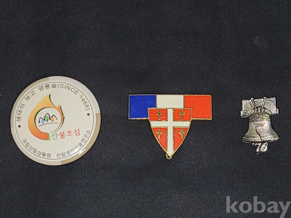 빈티지 프랑스 뱃지, 국립산림과학원 광릉숲 뱃지, 76 미국 자유의 종 뱃지 등 3종 일괄입니다.