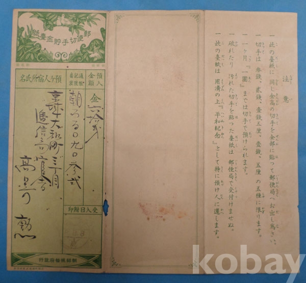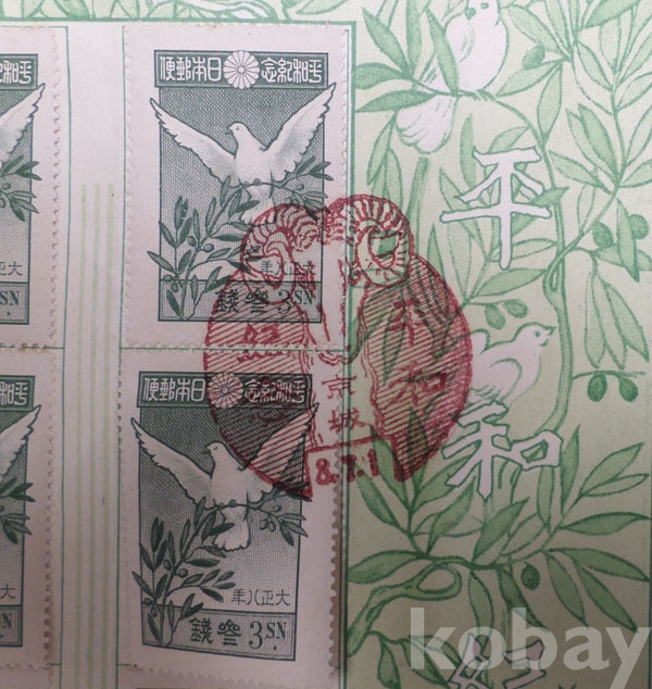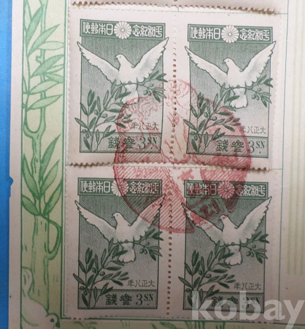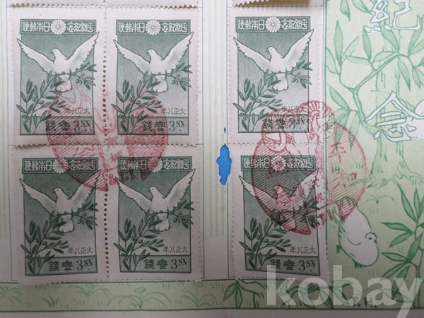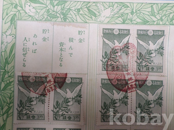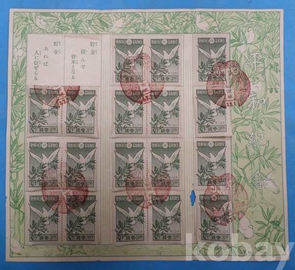 **** 일제강점기 조선총독부 우편절수저금대지*1919년 발행 평화기념우표 3전 18매첩부 京城,8.7.1 우표발행 초일 기념인(우표 2매 탈락된 흔적있음)