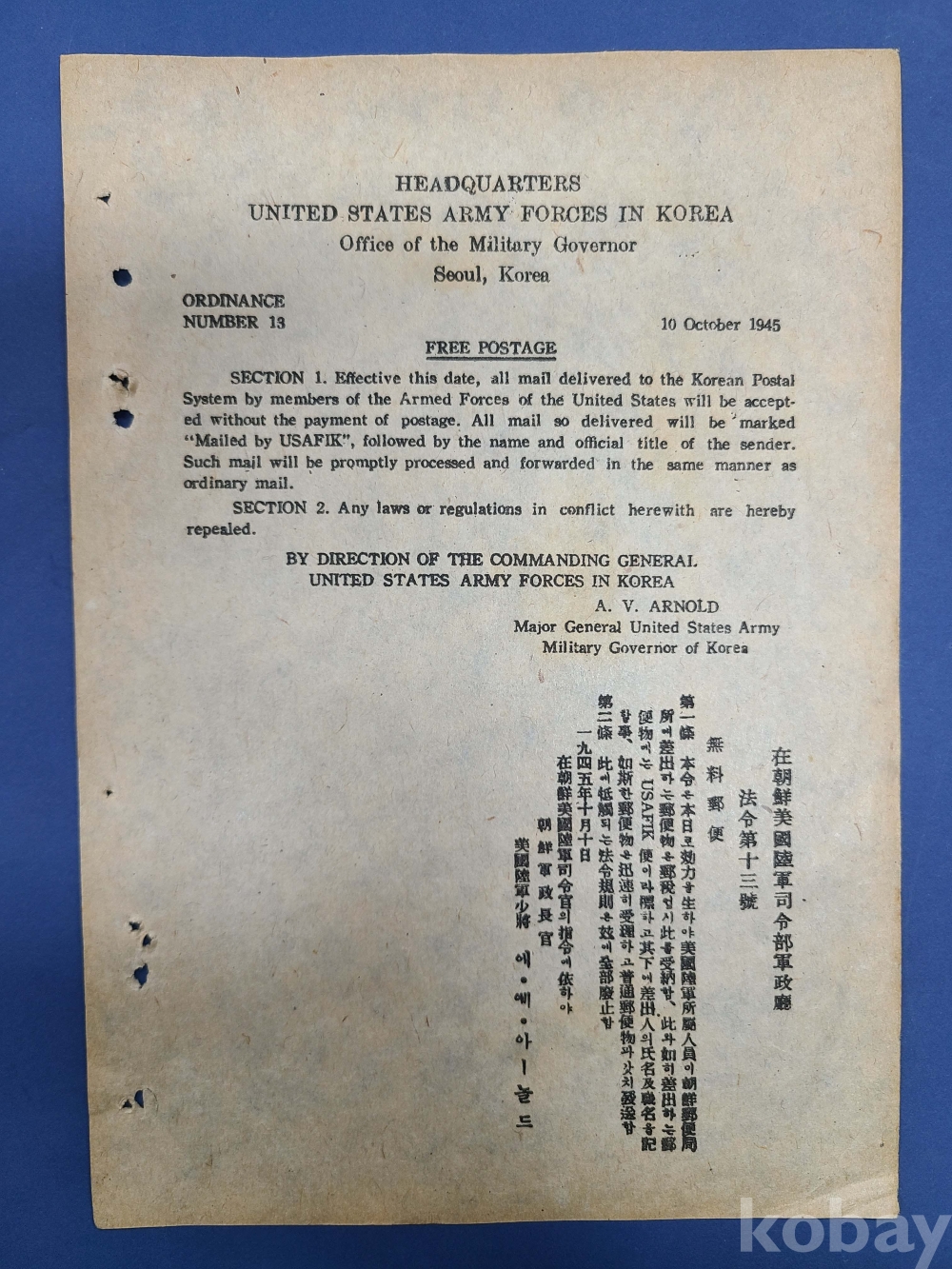 [在朝鮮美國陸軍司令部軍政廳 관보] 1945.10.10 법령제13호/*無料郵便