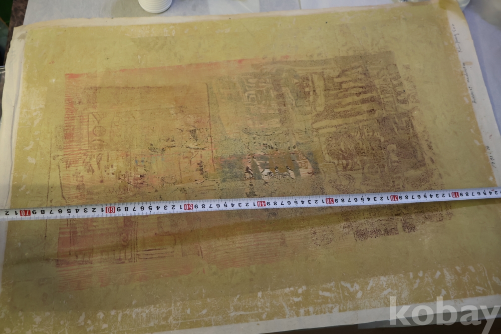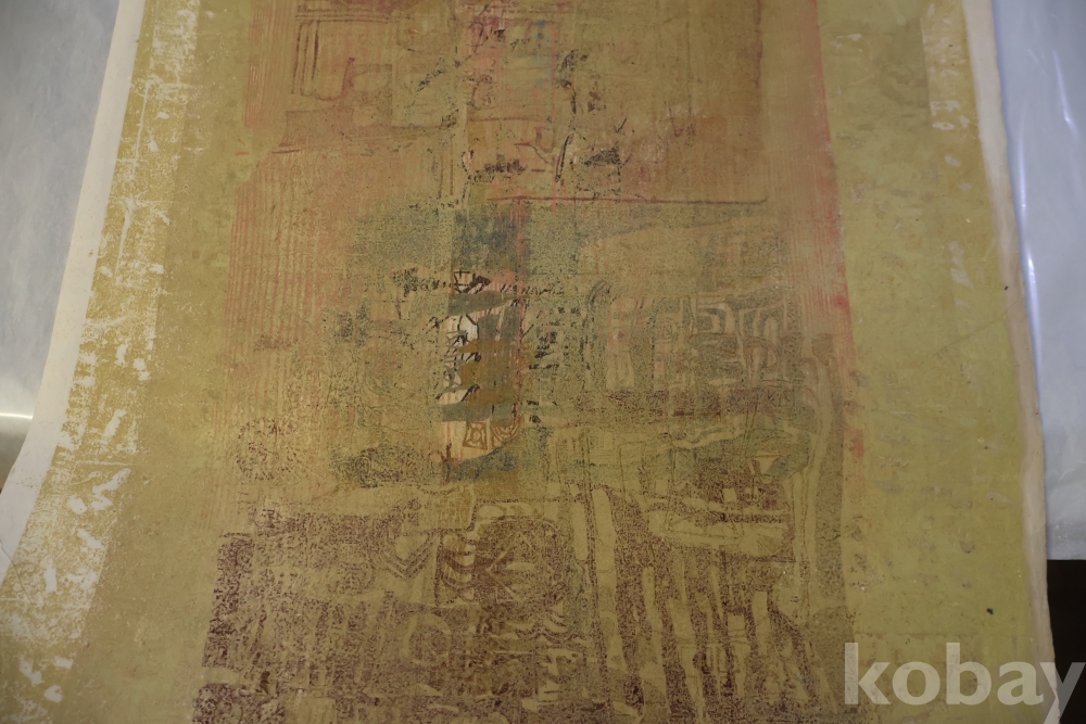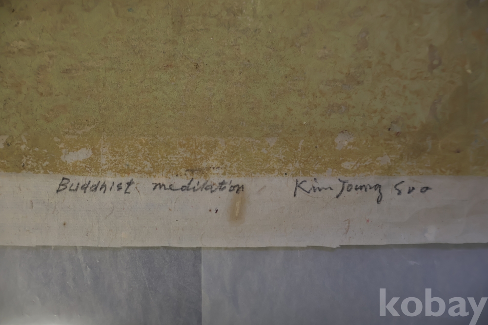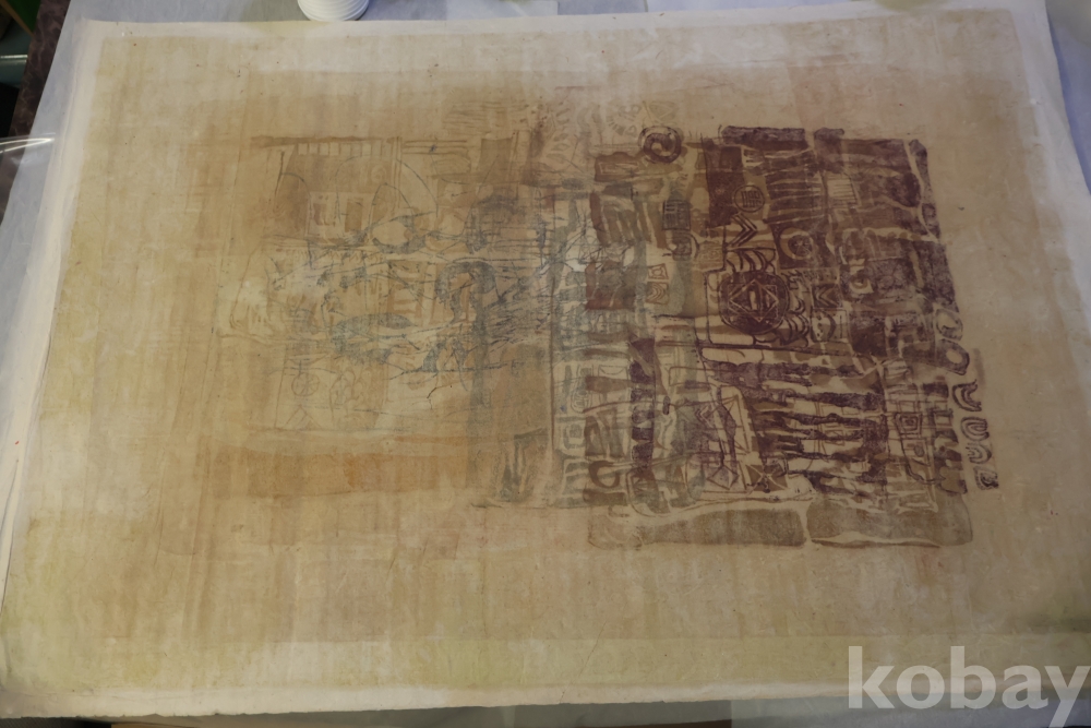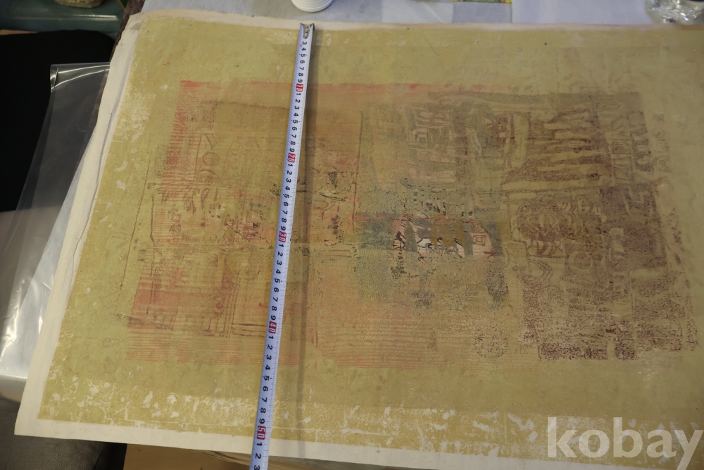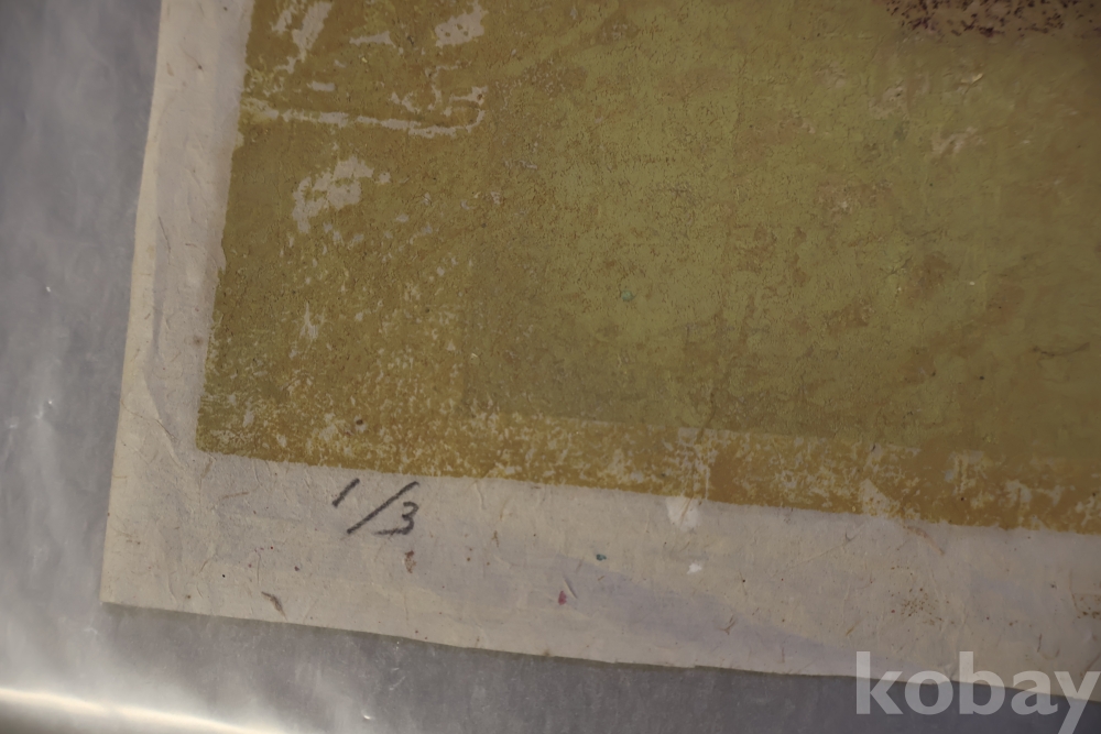 대형 김정수 화백의 초기 작 판화 임니다 디자인 색감 등등 멋진 작품 이며 사진 참조 하세요 세월의 갈라짐이 보임니다 13번 사진 배접 하면 더 멋짐니다