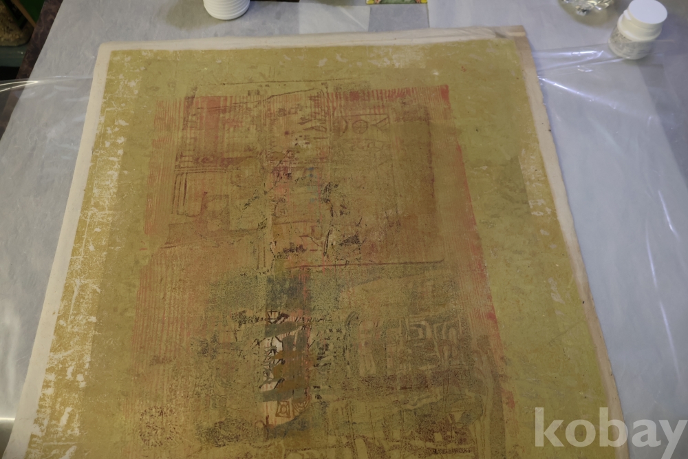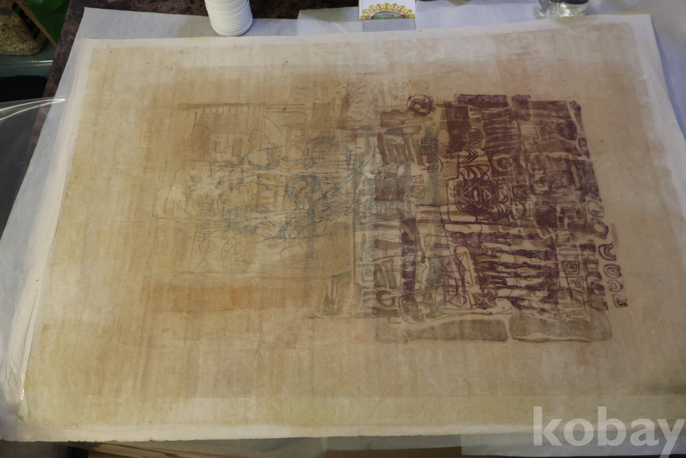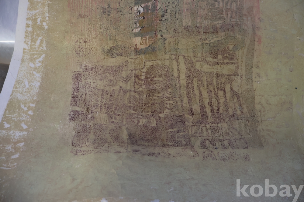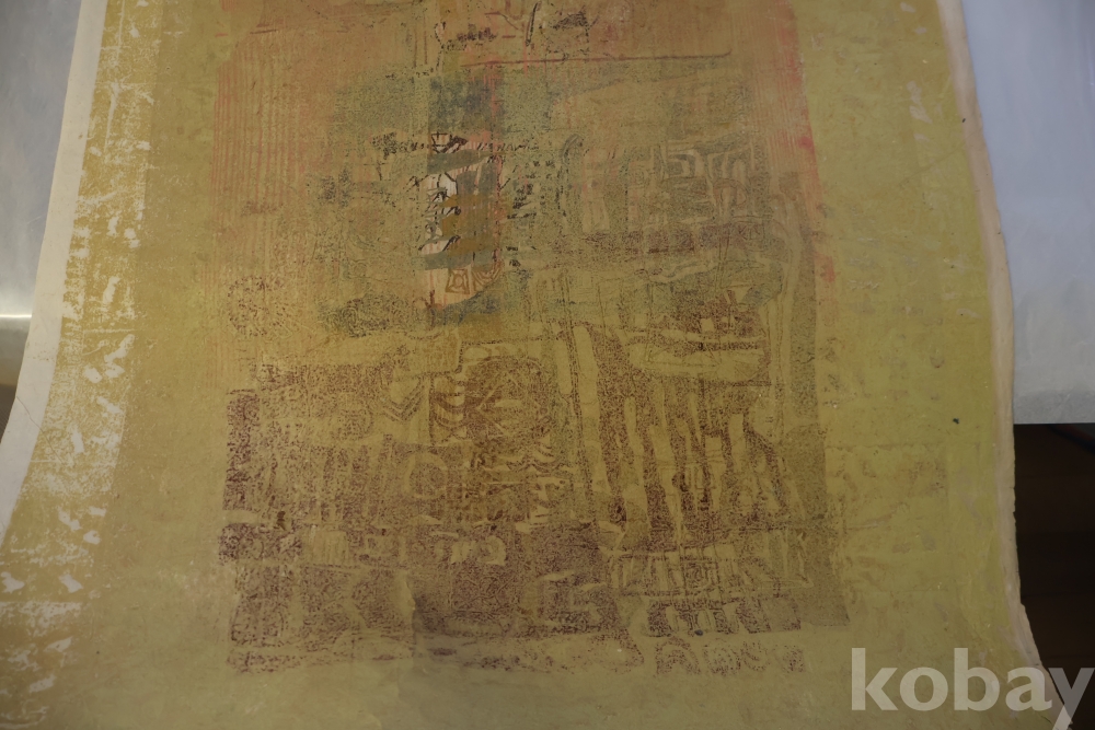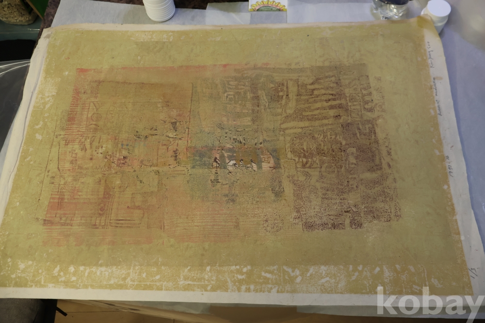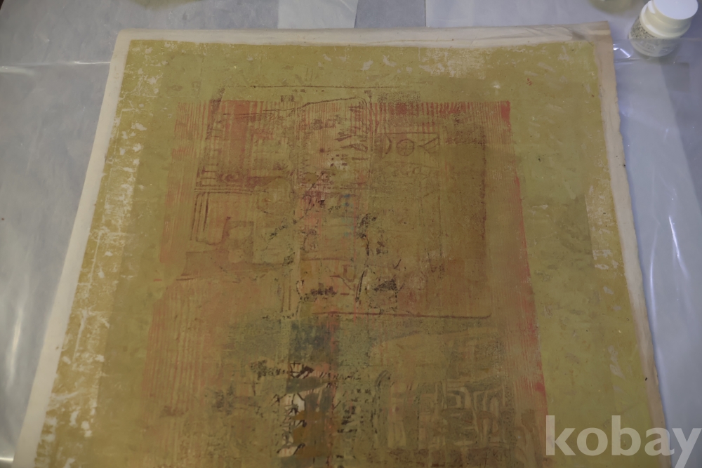 대형 김정수 화백의 초기 작 판화 임니다 디자인 색감 등등 멋진 작품 이며 사진 참조 하세요 세월의 갈라짐이 보임니다 13번 사진 배접 하면 더 멋짐니다