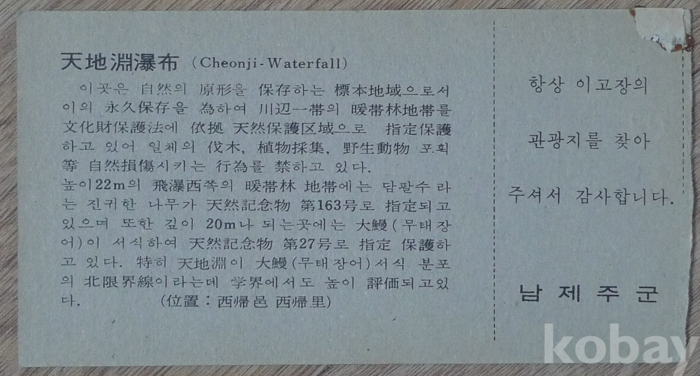 1970년대 제주도 천제연 폭포 입장권